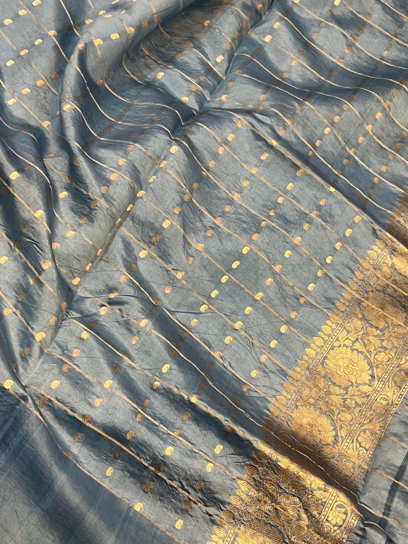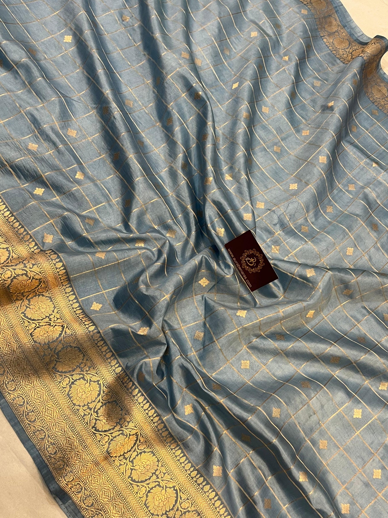 An amazing Handwoven Pure Silk in a Blue color to take your breath away. This vintage piece has allover cheks pattern in golden zari. The designer broad border is beautifully woven in mashru(satin) silk. The blouse piece is plain with border.