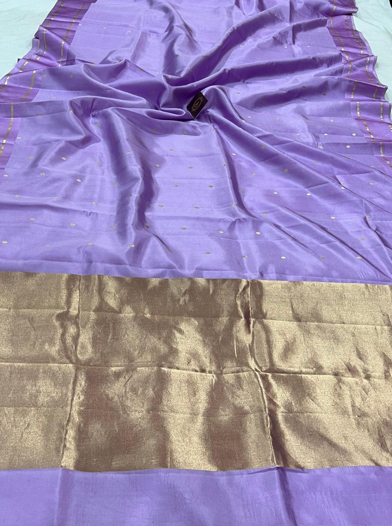 An amazing Handwoven Pure Silk in a Lavender color to take your breath away. This vintage piece has an allover Kadwa(Kadhua) motifs in golden zari. The border is beautifully woven in satin silk with zari lines. It comes with a plain blouse piece.