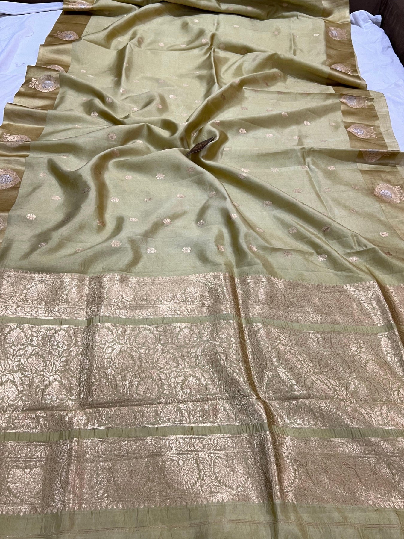 Pastel Olive Green Pure Banarasi Handloom Silk Saree