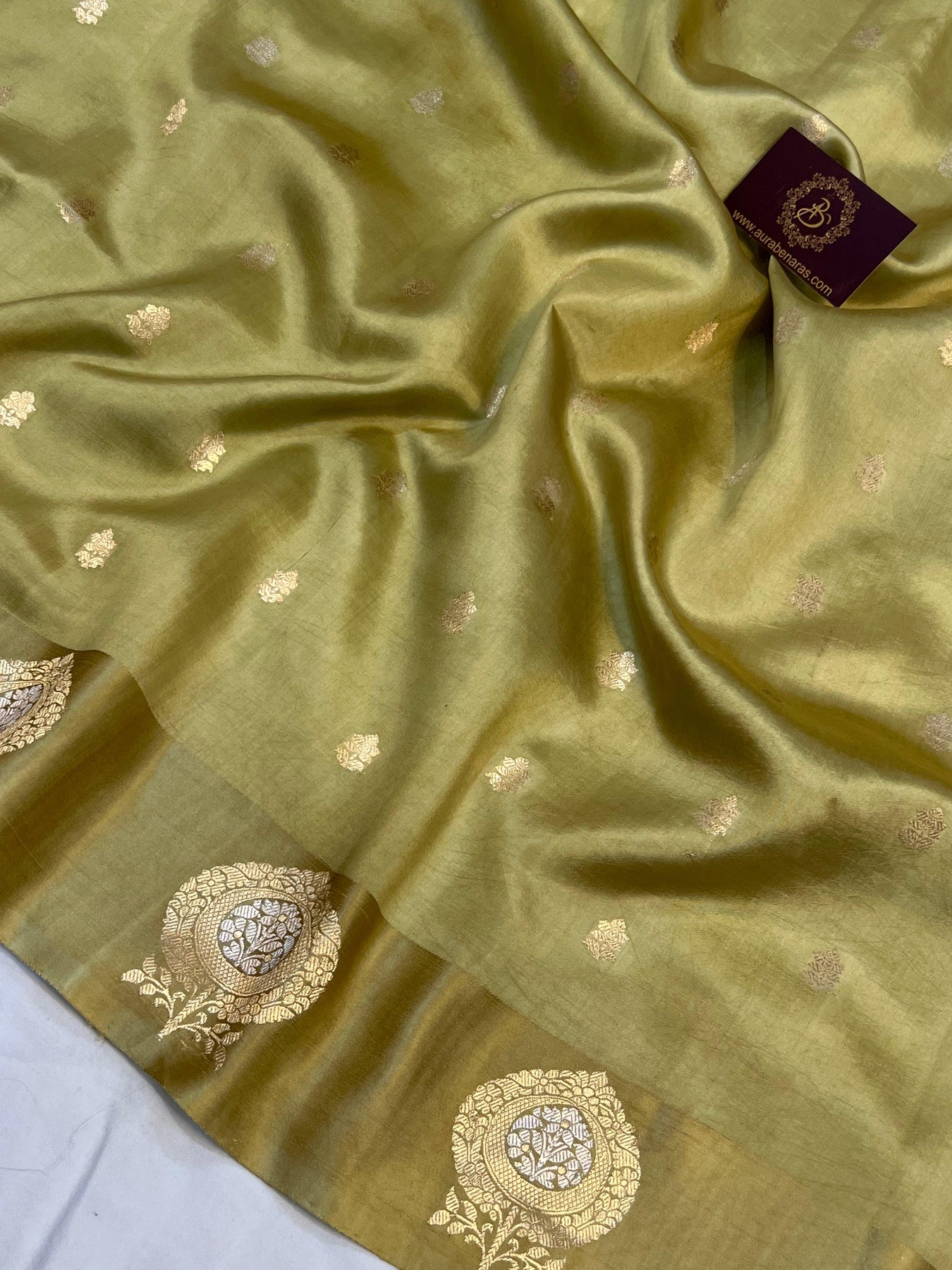 Pastel Olive Green Pure Banarasi Handloom Silk Saree - Aura Benaras