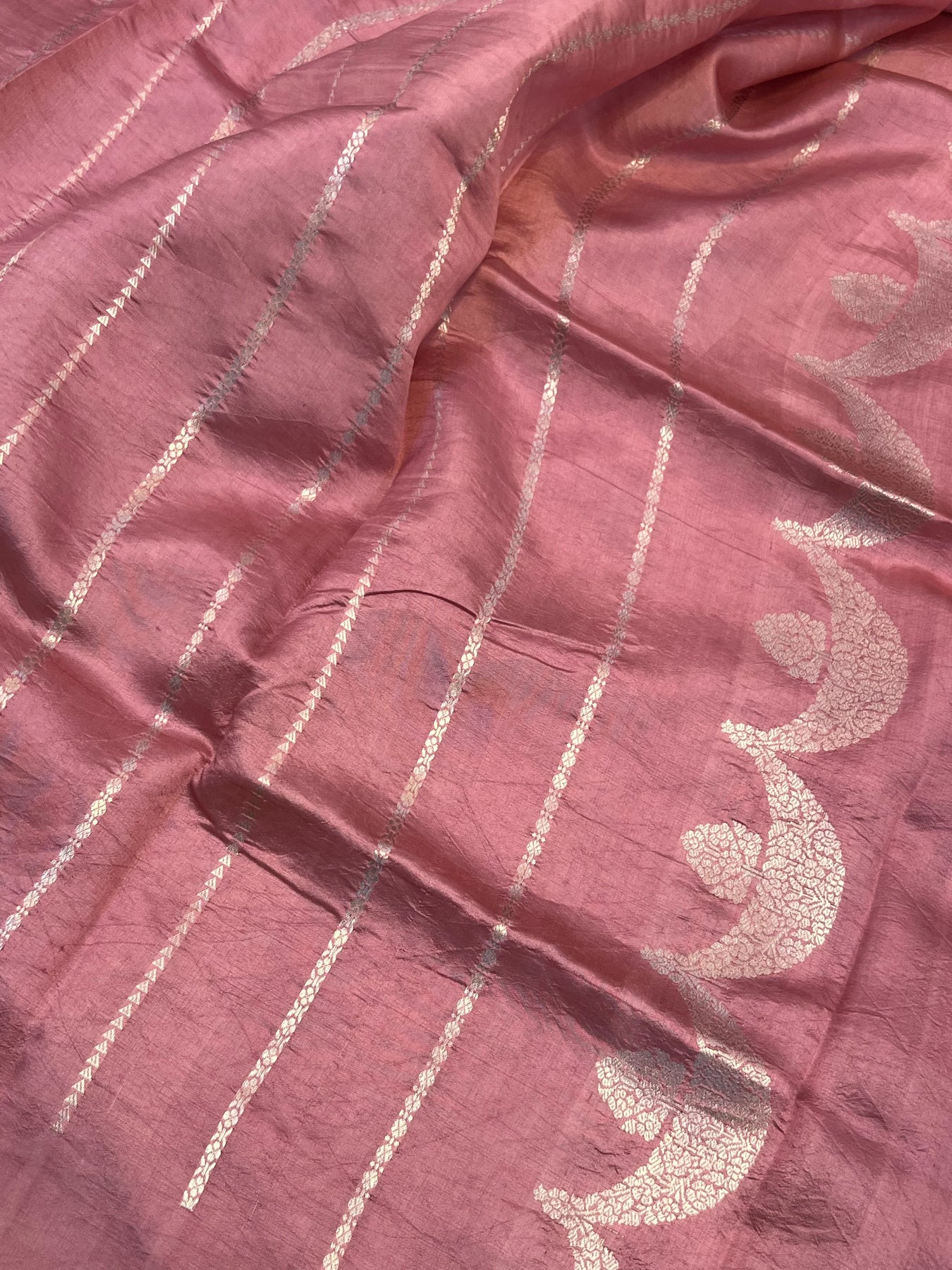 Step into timeless elegance with this exquisite Baby Pink pure silk handloom banarasi saree, meticulously crafted with the age-old Kadhwa weaving technique. Adorned with delicate Kadhwa butis scattered across the body and complemented by intricately woven Kadhwa borders, this saree is a masterpiece of heritage craftsmanship. The shimmering silver zari work adds a regal touch, making it perfect for weddings, festive occasions, or formal celebrations.