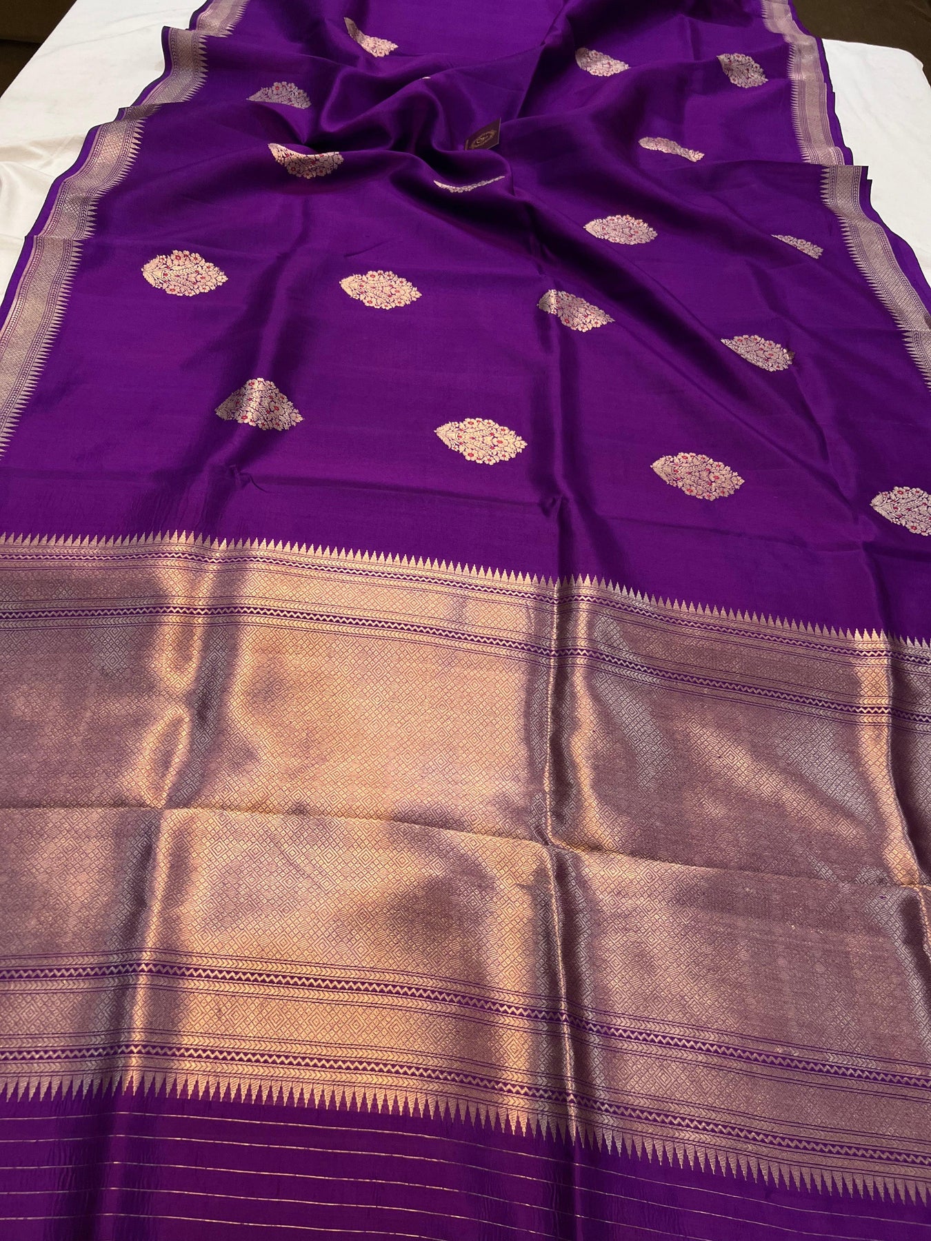 An amazing Handwoven silk saree in a Purple color to take your breath away. This vintage piece has Kadwa(Kadhua) floral motifs with meenakari work all over the saree. It has a kadhwa banarasi border with golden zari. Blouse piece is plain with border. It takes around 15-20 days for artisans to weave one.