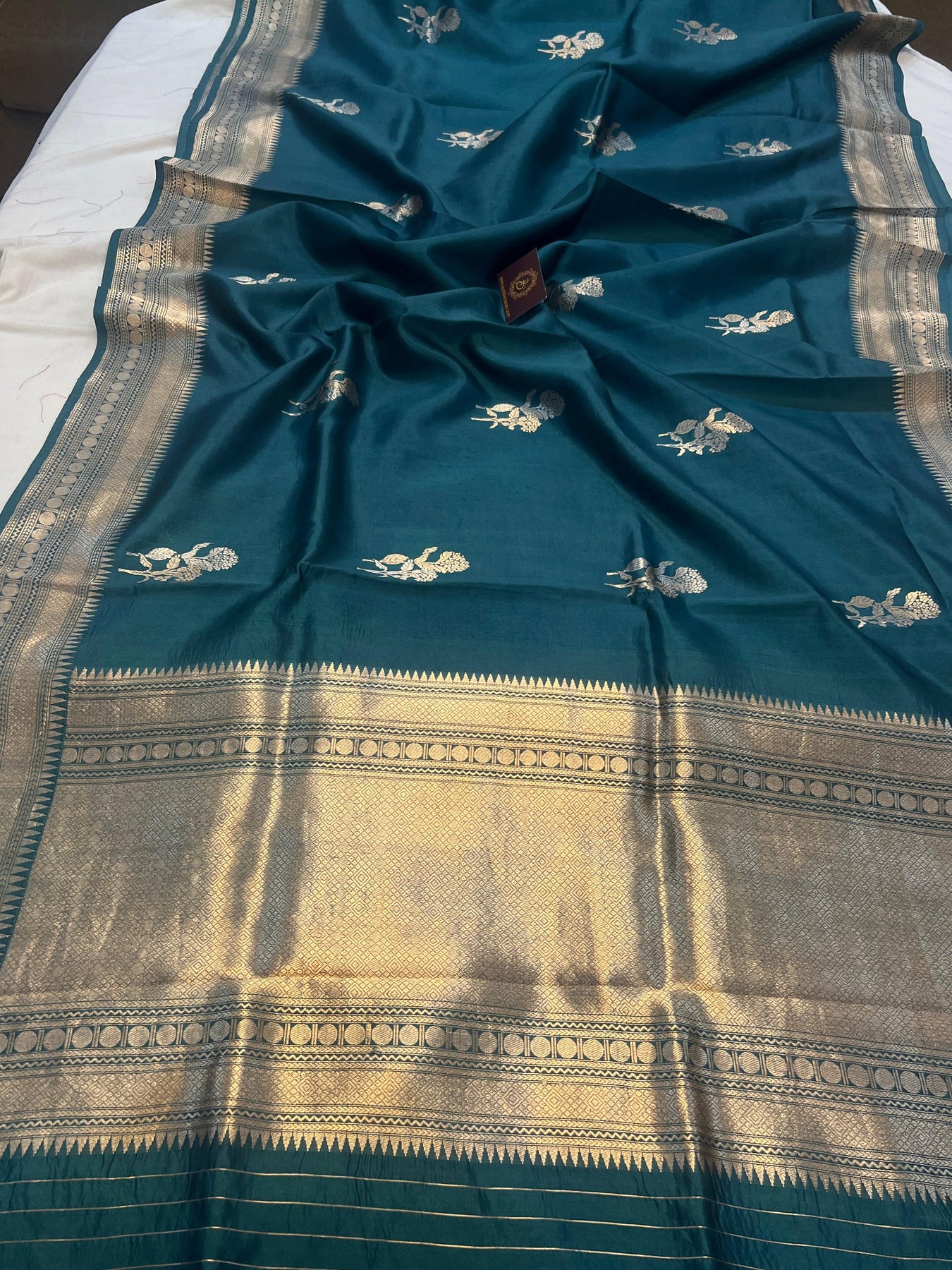 An amazing Handwoven silk saree in a Rama Green color to take your breath away. This vintage piece has Kadwa(Kadhua) floral motifs with sona rupa work all over the saree. It has a kadhwa banarasi border with golden zari. Blouse piece is plain with border. It takes around 15-20 days for artisans to weave one.