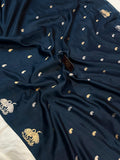 This pure Banarasi handloom silk saree features intricate allover kadhwa motifs, adding a rich, textured elegance to the fabric. The saree is bordered with a striking silk border, adorned with unique kadhwa animal motifs, bringing a distinct touch of artistry and nature-inspired design. The blouse piece is plain, offering a subtle, refined complement to the saree's detailed beauty.