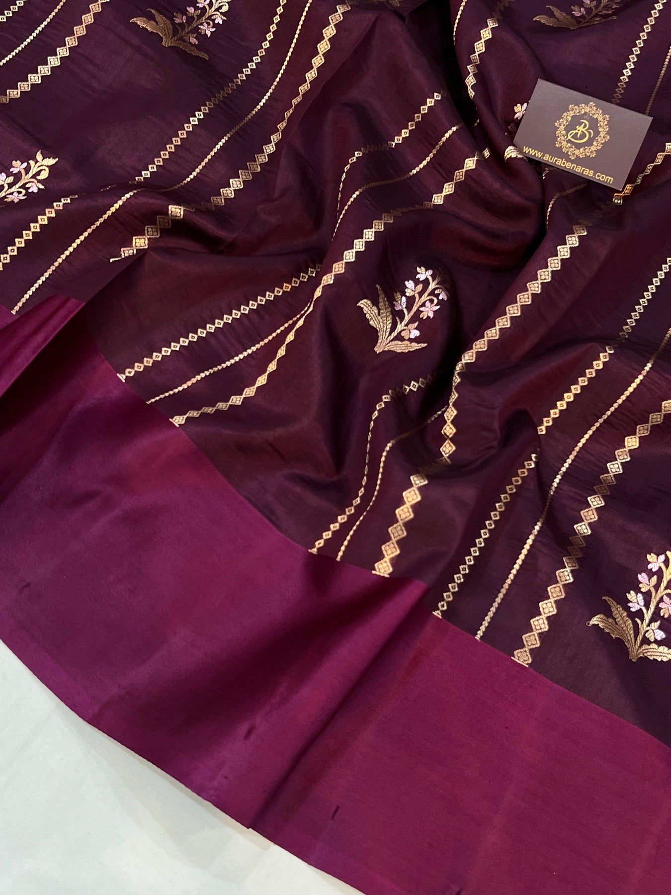 An amazing Handwoven Pure Silk in a Wine color to take your breath away. This vintage piece has an allover stripes work with Kadwa(Kadhua) sona rupa motifs in between. The plain border is beautifully woven in satin silk. The blouse piece has small motifs.