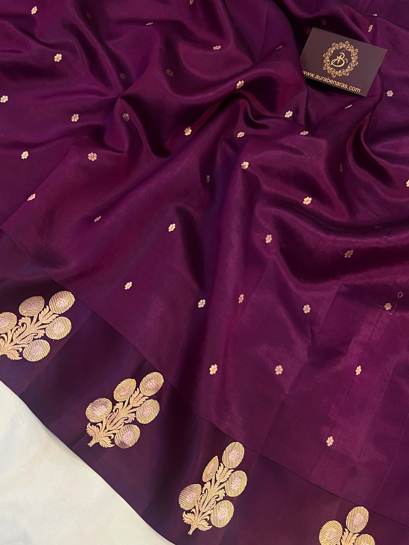 An amazing Handwoven Pure Silk in a Wine color to take your breath away. This vintage piece has an allover Kadwa(Kadhua) motifs in golden zari. The border is beautifully woven in satin silk with kadhwa sona and rupa motifs. It comes with a stripes work blouse piece.