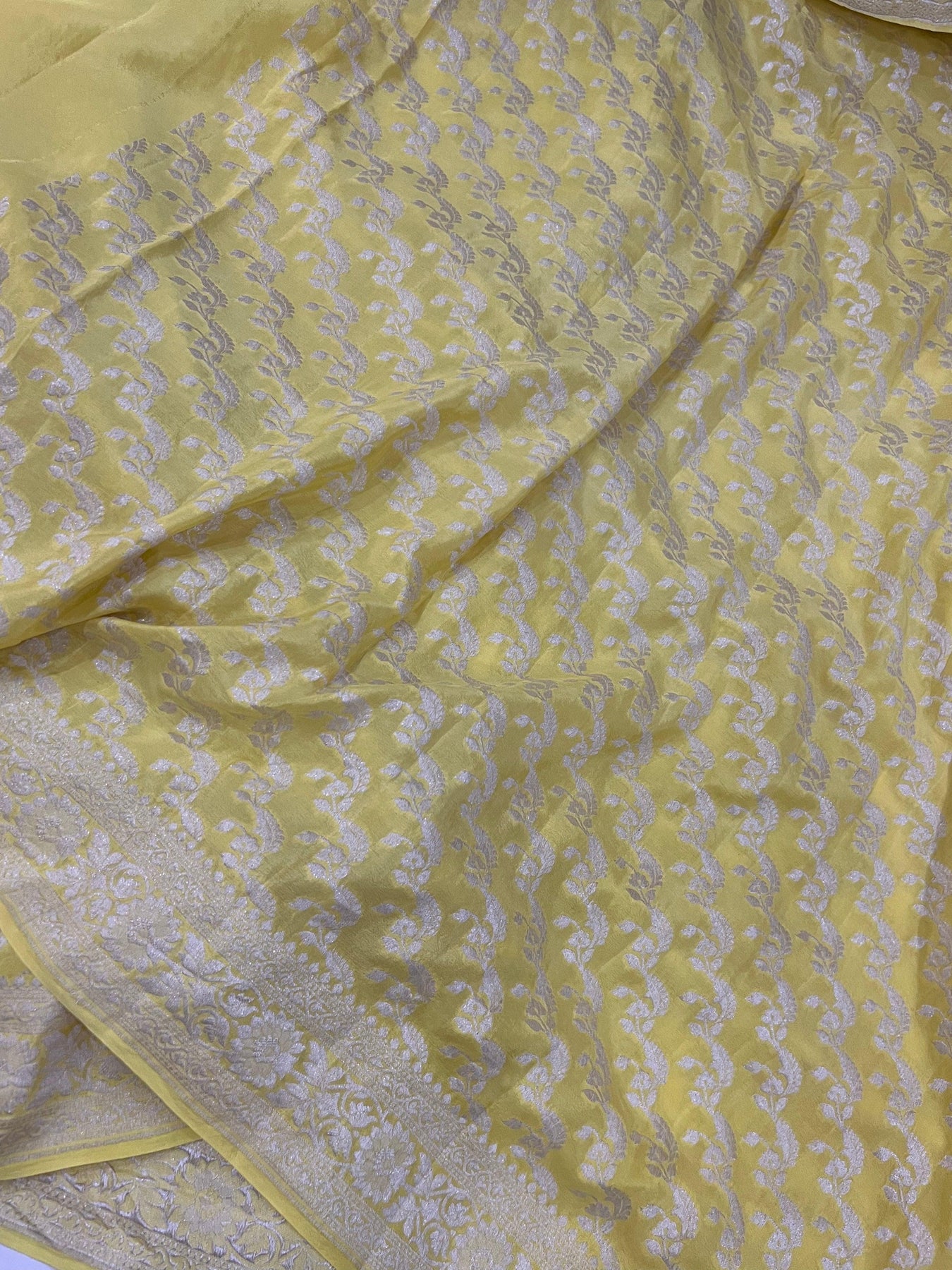A stunning Pastel Yellow Banarasi handloom classic. The authentic buti work in silver zari handwoven in the finest chiffon georgettes, comes with a same color heavy jaal work blouse. It takes around 10 days to weave this rich and luxurious piece of our tradition.