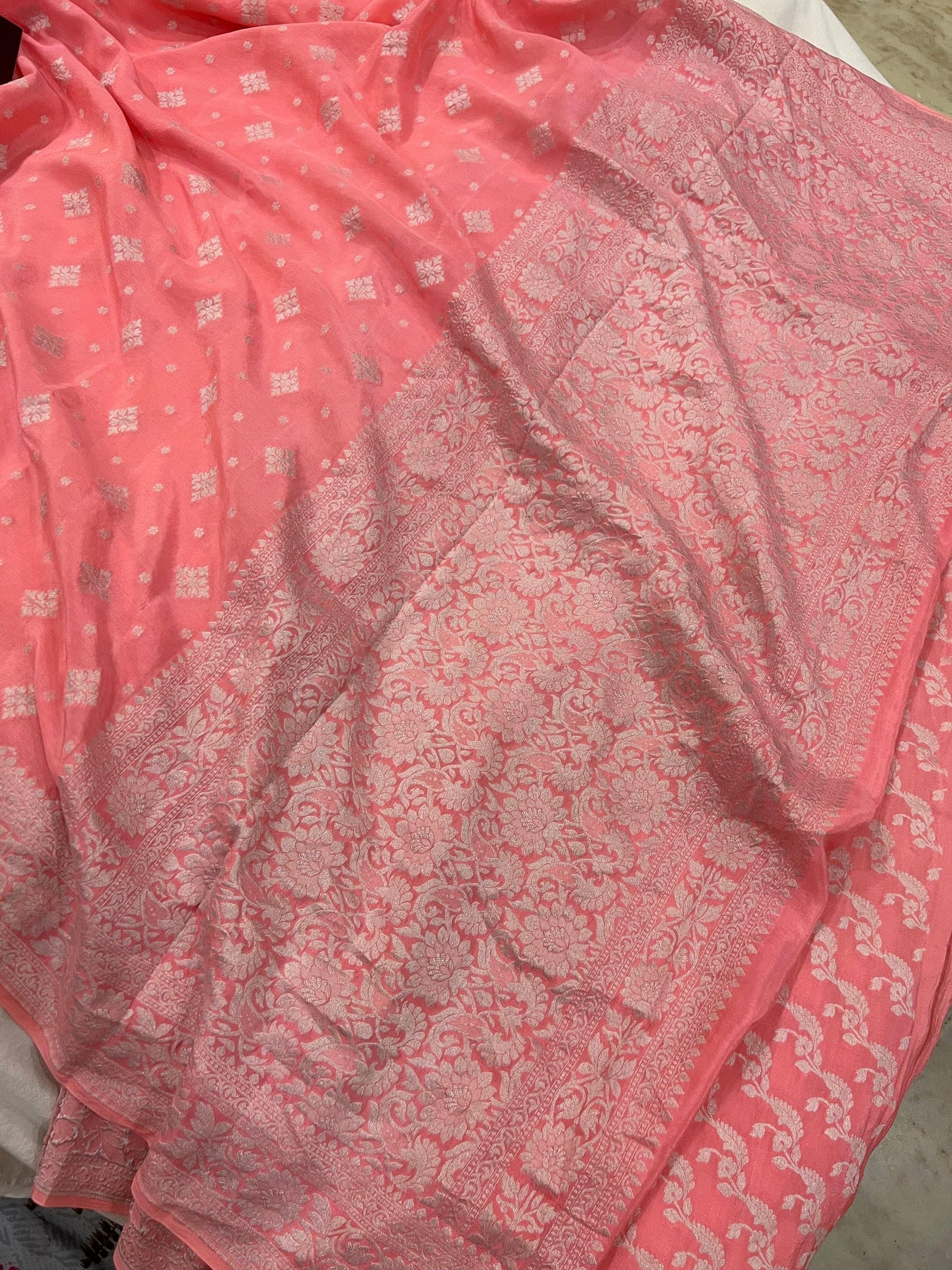 Peachish Pink Pure Banarasi Khaddi Crepe Silk Saree
