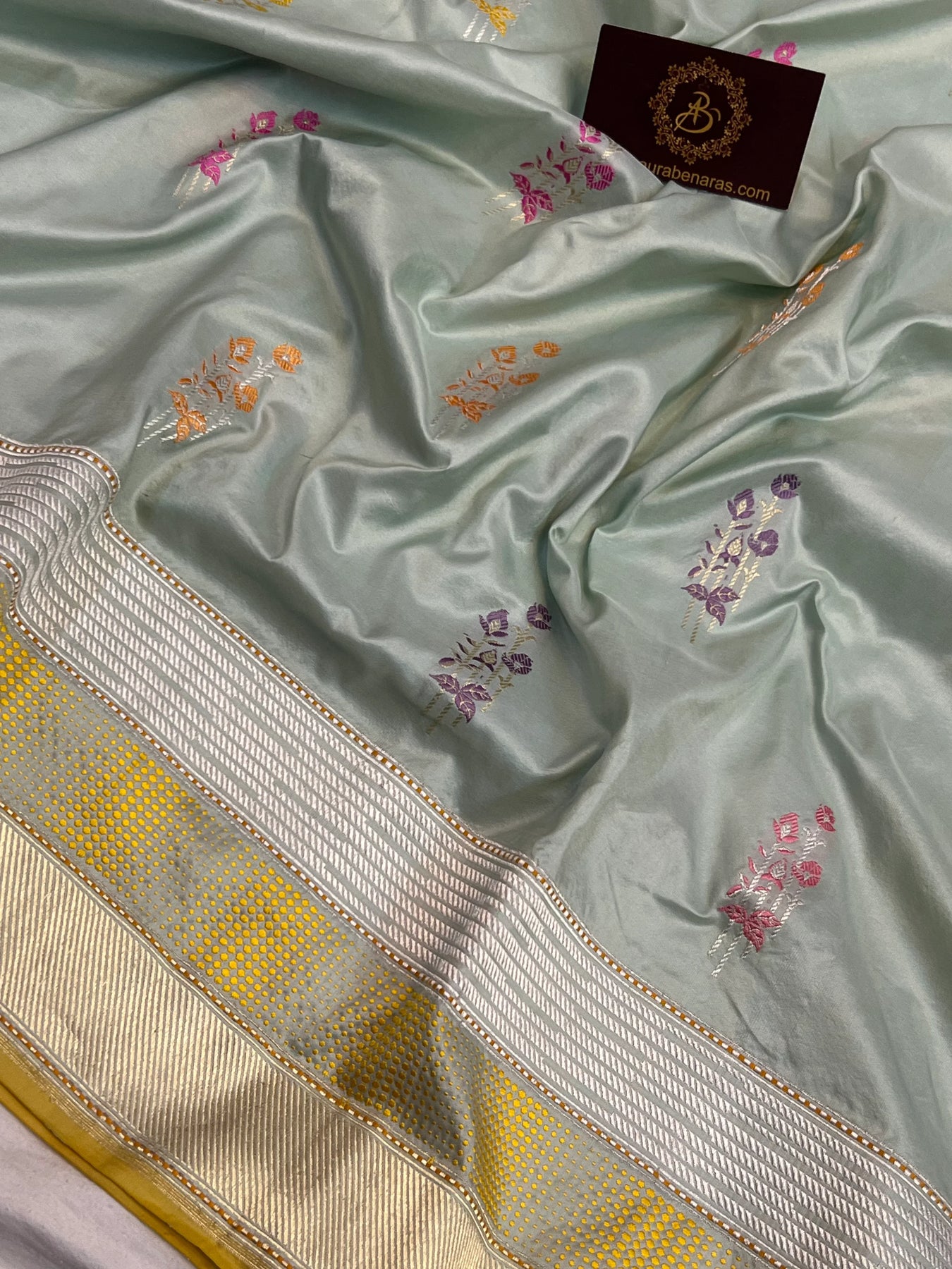 A masterpiece of intricate craftsmanship, this Dirty Martini Shade pure Katan silk saree is a beautiful ode to Banarasi weaving traditions. The luxurious, lustrous Katan silk forms a graceful canvas for the delicate kadhwa meenakari butis—each one handwoven using the painstaking kadhwa technique, elevated with subtle meenakari detailing that adds soft hints of color and texture.