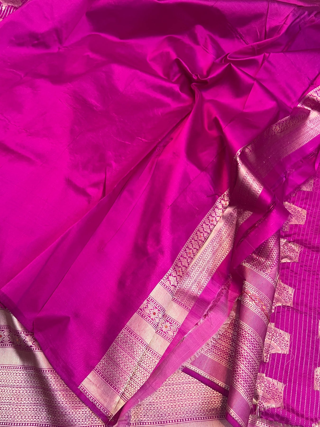 Indulge in the timeless elegance of this Purple pure Katan silk handloom Banarasi saree, meticulously crafted with exquisite allover brocade work. The saree features a lovely geometric design woven in shimmering golden zari, creating a rich and captivating texture that exudes sophistication. A stunning designer border with Meenakari work frames the saree, adding vibrant color accents and enhancing its regal appeal. Perfect for weddings, festivities, and grand occasions, this luxurious drape is paired with a plain blouse piece featuring a coordinating border, offering a perfect balance to the ornate detailing. Elevate your ethnic wardrobe with this masterpiece that seamlessly blends traditional Banarasi artistry with modern charm.