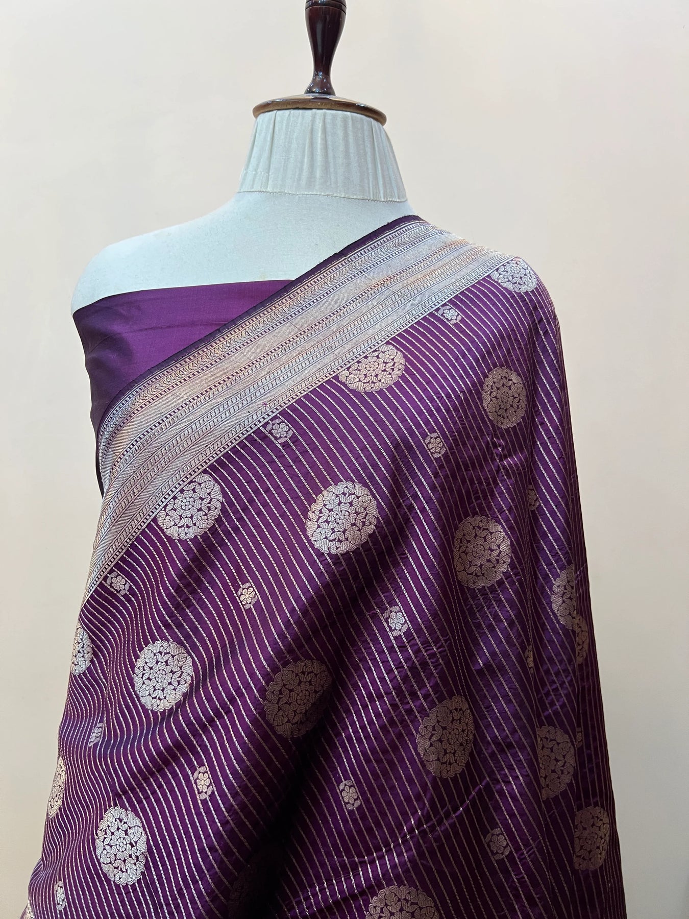 Indulge in the timeless elegance of this Wine pure Katan silk handloom Banarasi saree, meticulously crafted with exquisite allover brocade work. The saree features a lovely geometric design woven in shimmering golden zari, creating a rich and captivating texture that exudes sophistication. A stunning designer border with Meenakari work frames the saree, adding vibrant color accents and enhancing its regal appeal. Perfect for weddings, festivities, and grand occasions, this luxurious drape is paired with a plain blouse piece featuring a coordinating border, offering a perfect balance to the ornate detailing. Elevate your ethnic wardrobe with this masterpiece that seamlessly blends traditional Banarasi artistry with modern charm.