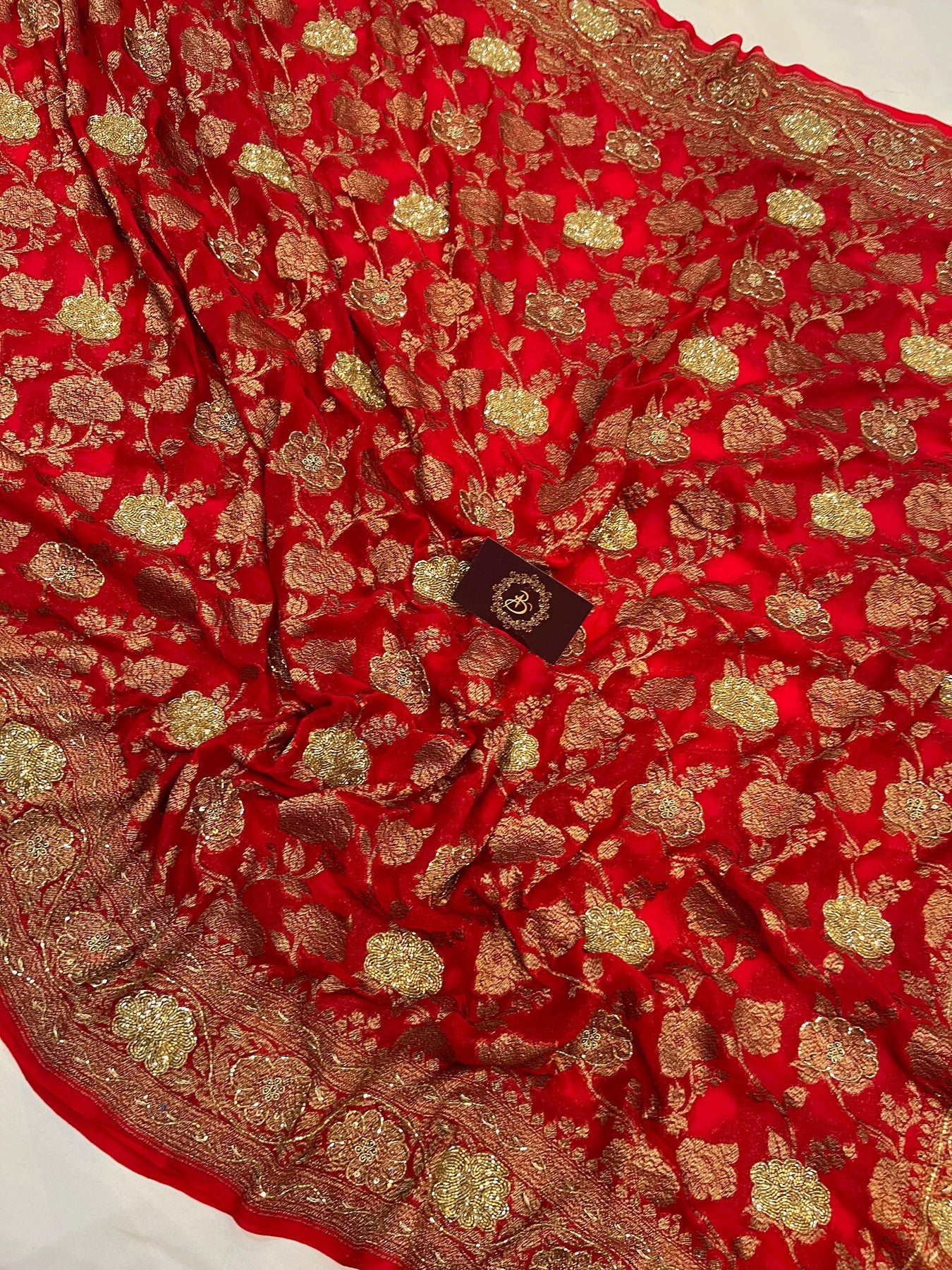 Pre Order :: Red Zardozi Pure Banarasi Khaddi Georgette Saree