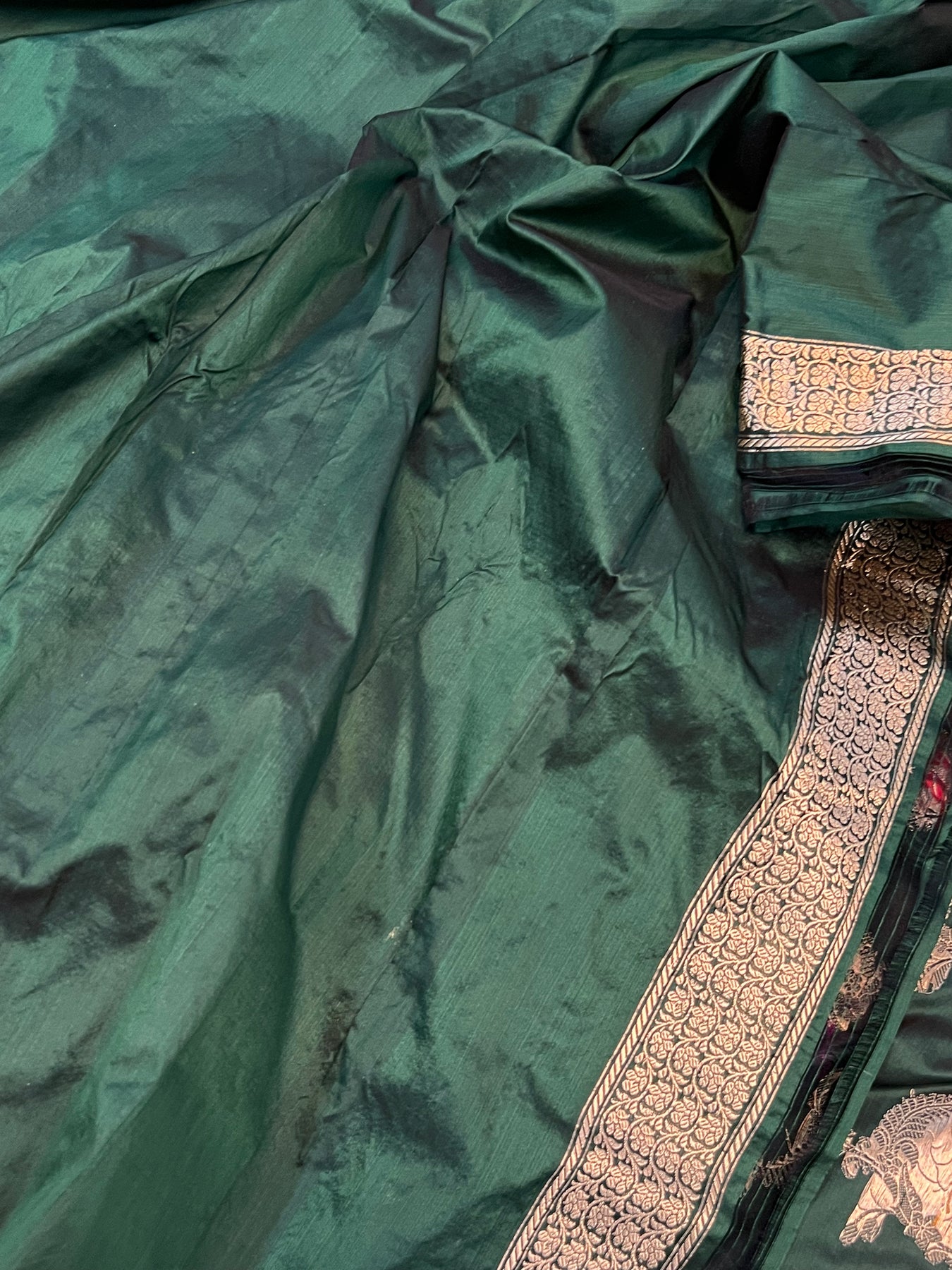 - Color - An enchanting Bottle Green with scintillating palla and border.