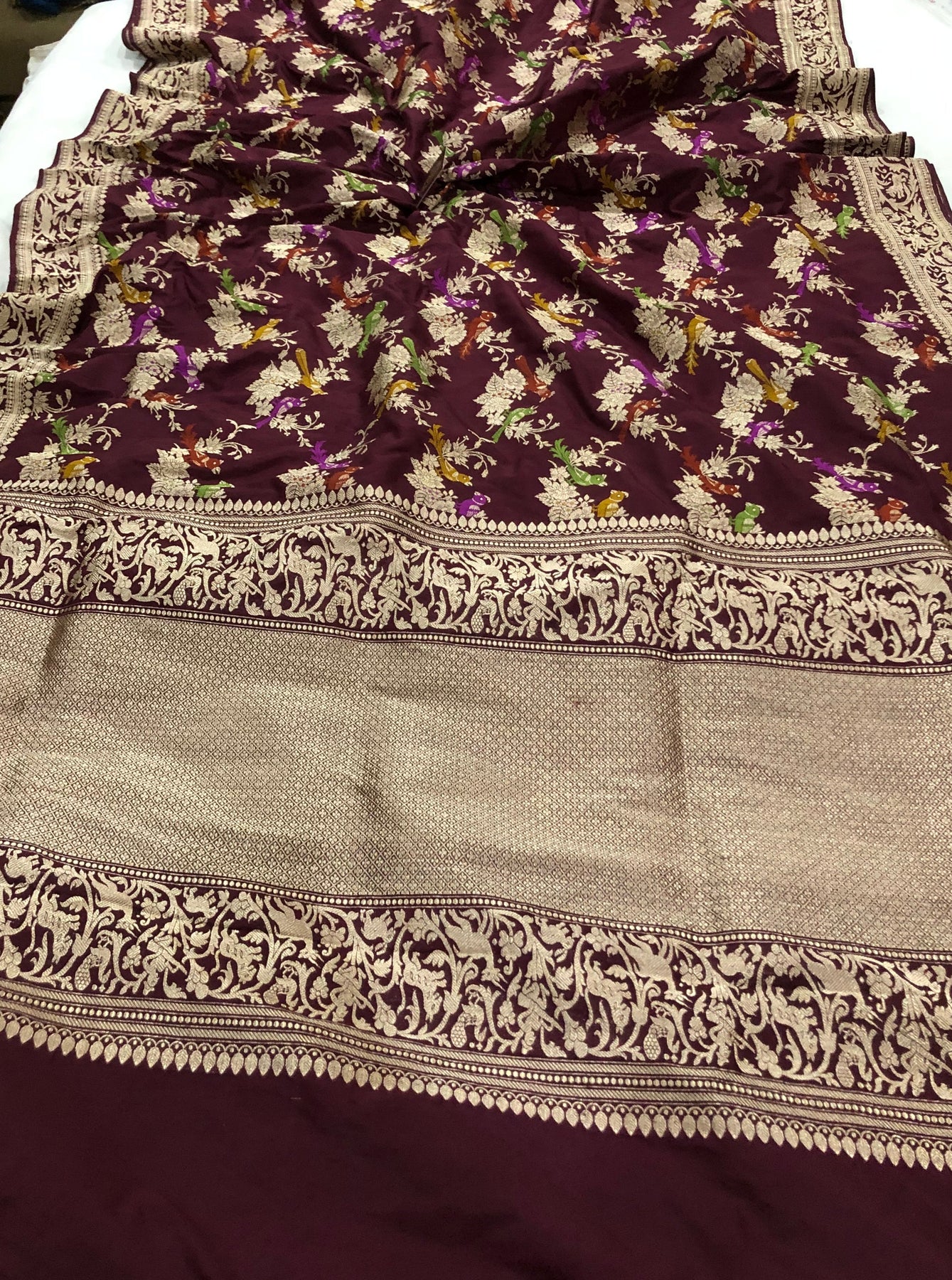 A stunning Deep Maroon Banarasi handloom classic. The Kadwa(Kadhua) shikargah Jaal with meenakari work with gold zari handwoven in the finest katan silk, comes with a plain blouse. It takes around 40-45 days to weave this rich and luxurious piece of our tradition.