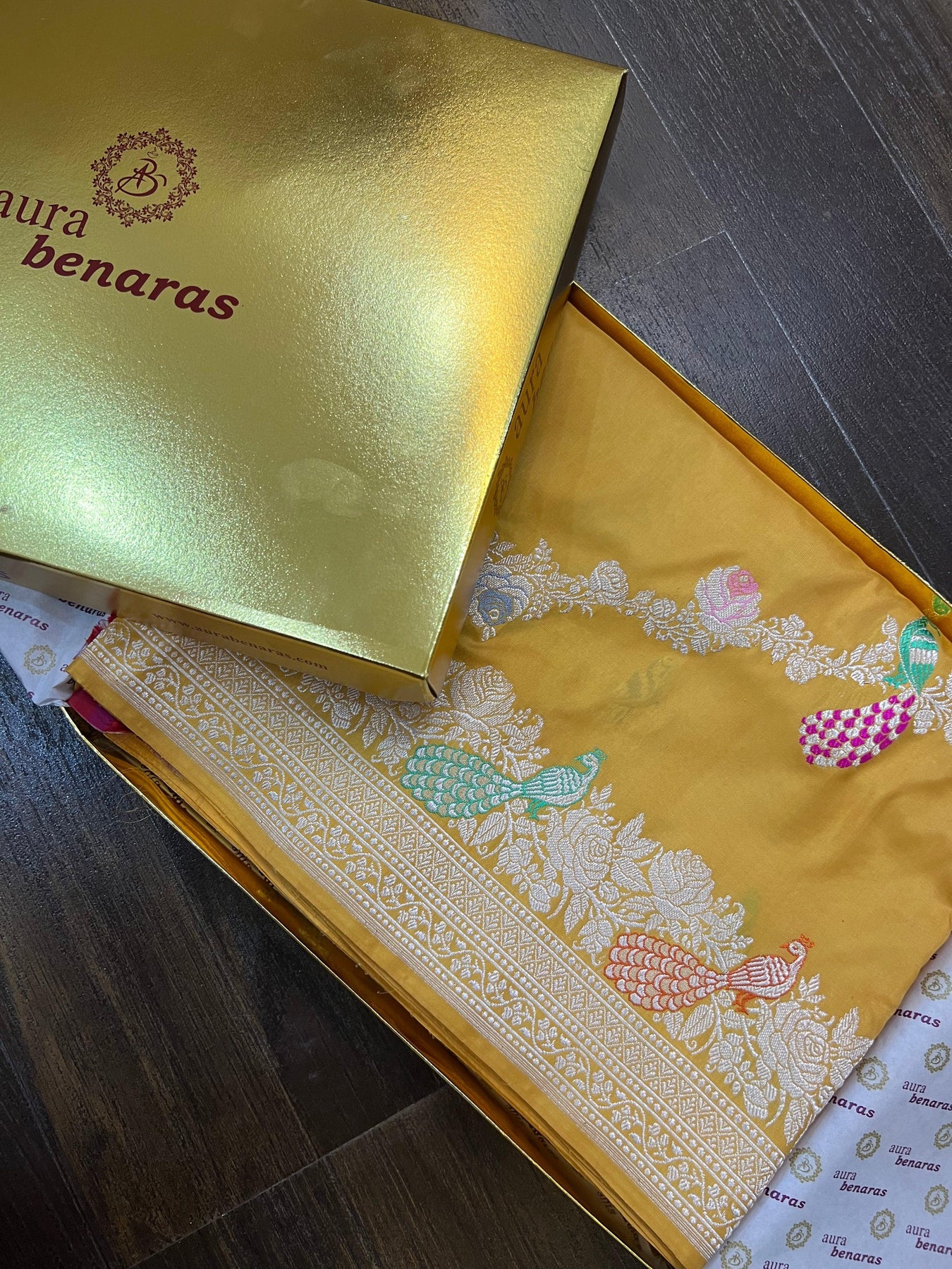 English Yellow Pure Katan Silk Banarasi Handloom Kadwa Meena Jangla Saree