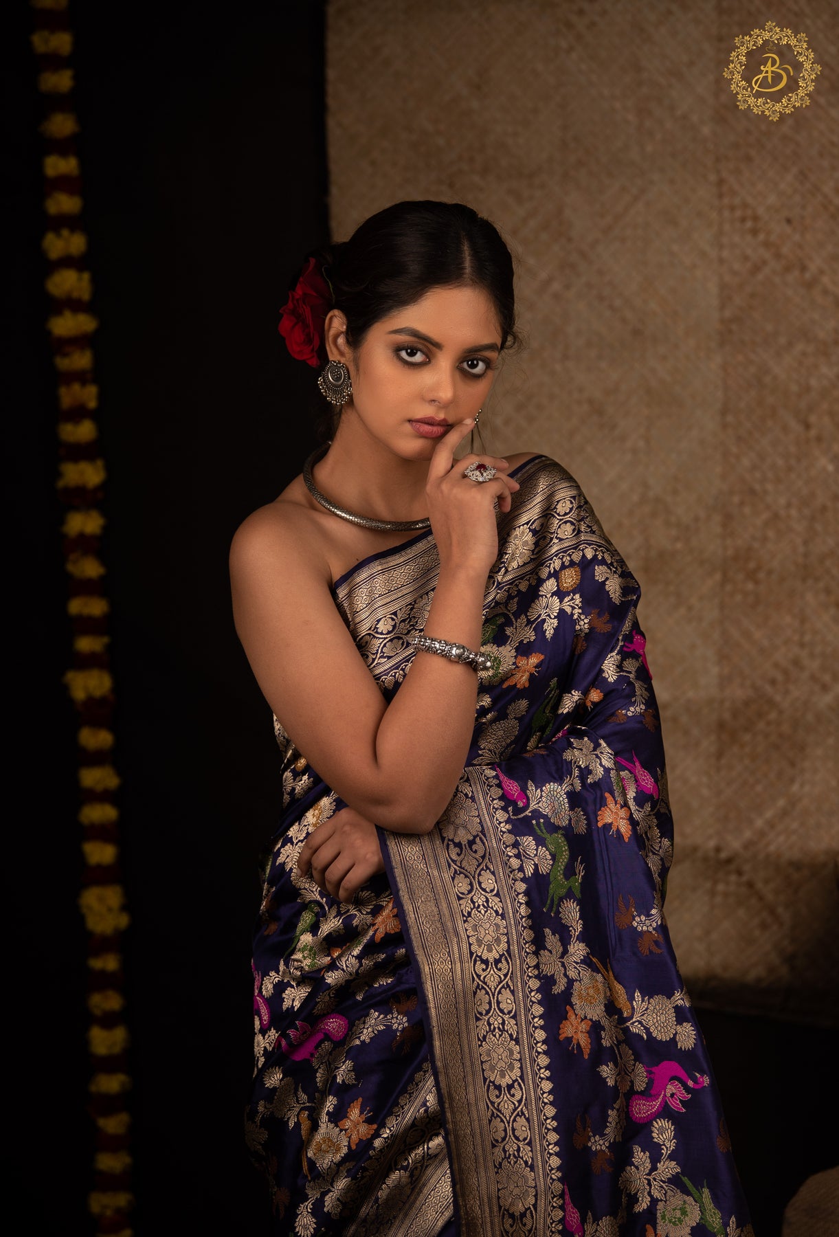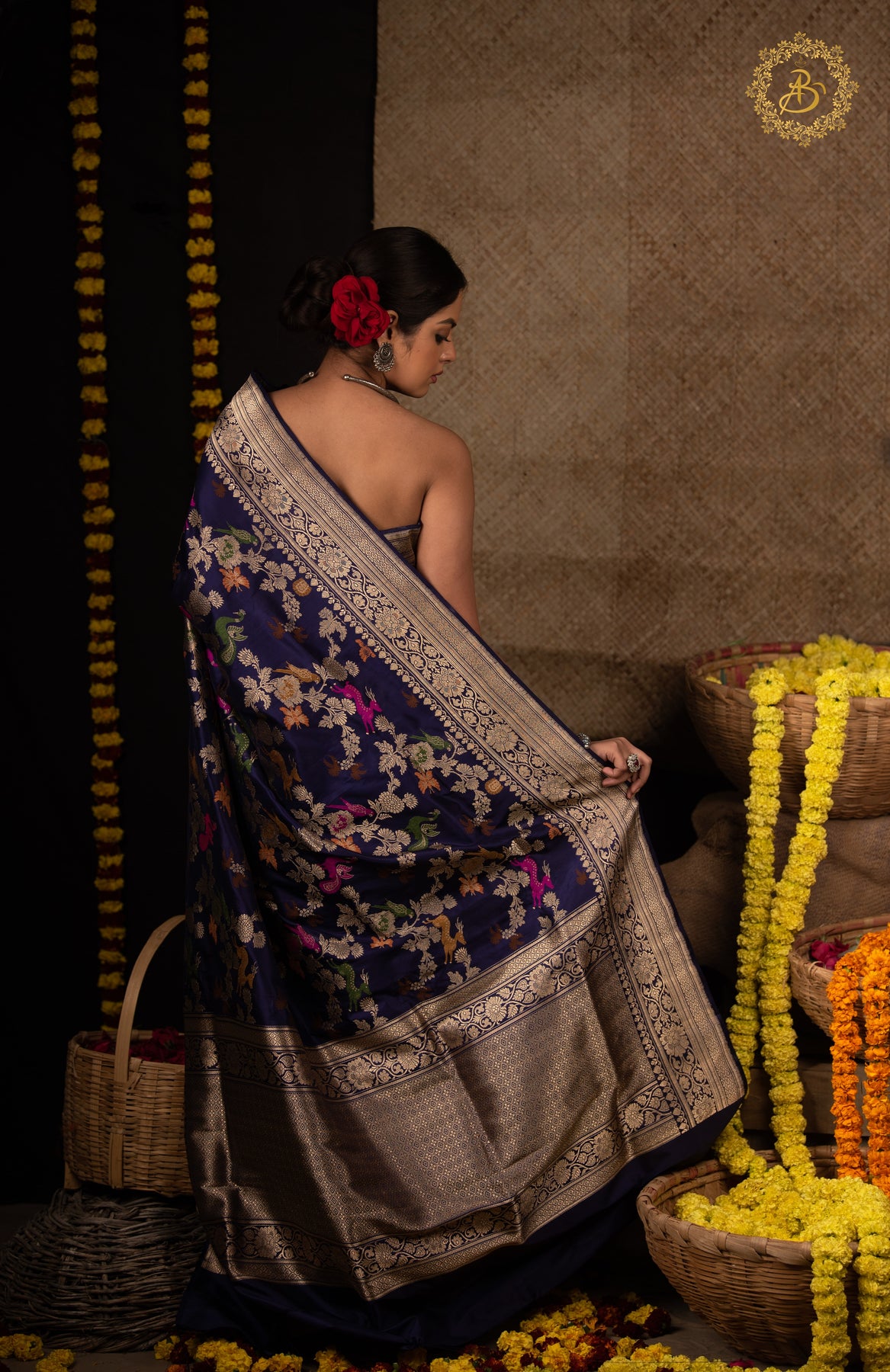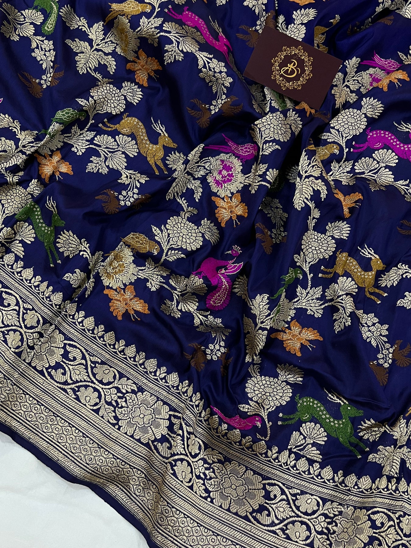 A stunning Navy Blue Banarasi handloom classic. The Kadwa(Kadhua) shikargah Jaal with meenakari work with gold zari handwoven in the finest katan silk, comes with a plain blouse. It takes around 40-45 days to weave this rich and luxurious piece of our tradition.