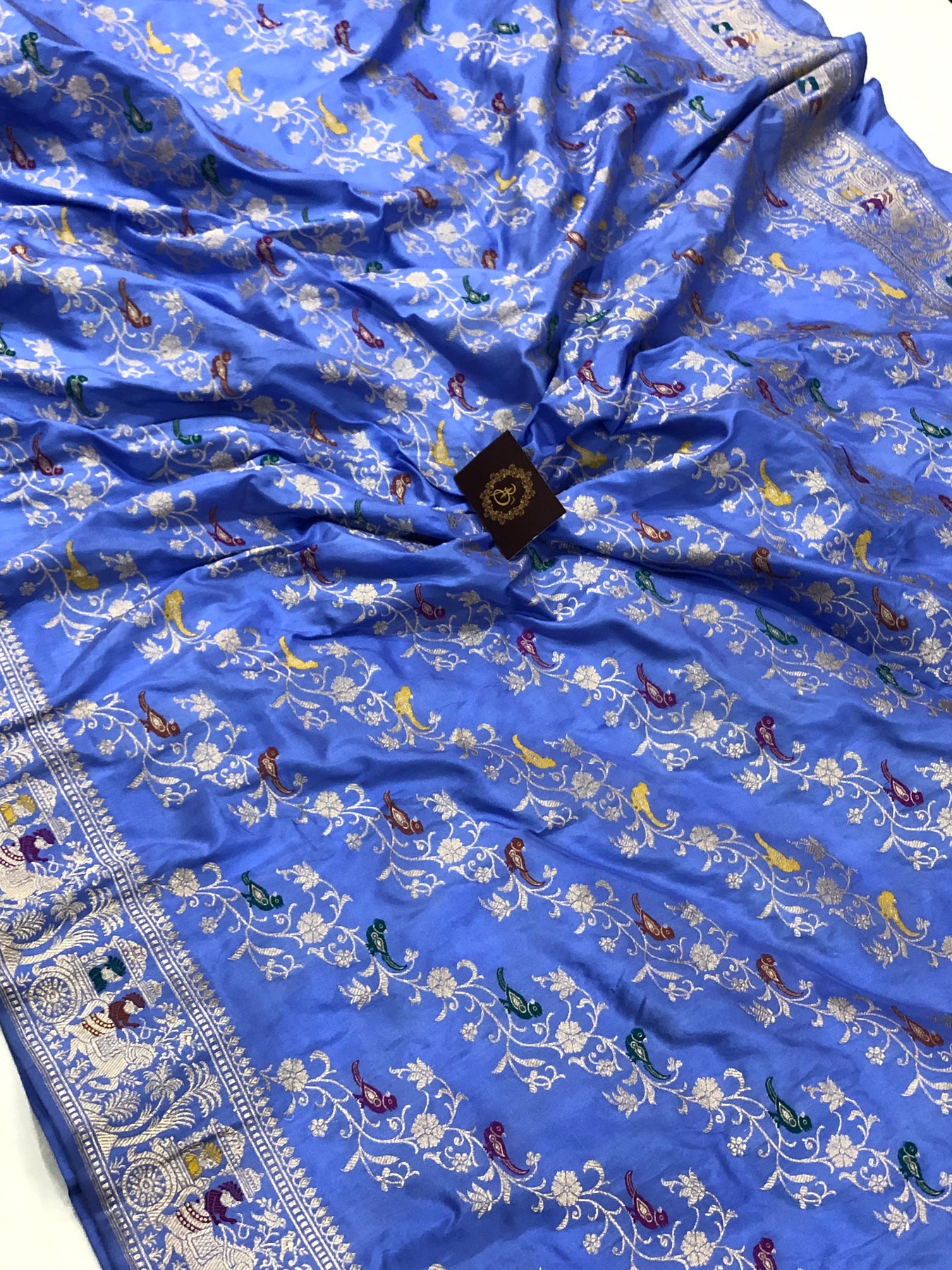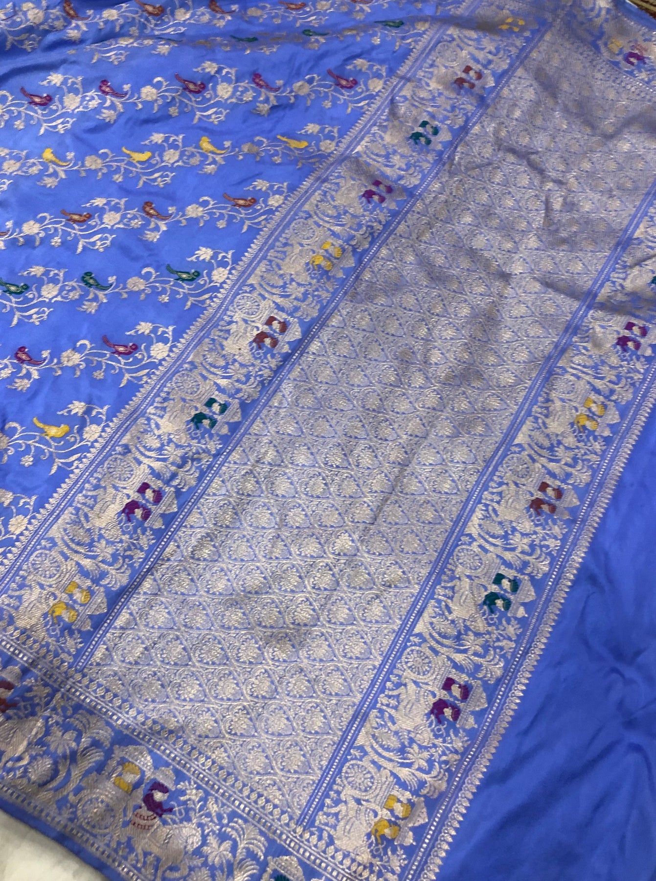 A stunning Ultramine Blue Banarasi handloom classic. The Kadwa(Kadhua) shikargah Jaal with meenakari work with gold zari handwoven in the finest katan silk, comes with a plain blouse. It takes around 40-45 days to weave this rich and luxurious piece of our tradition.