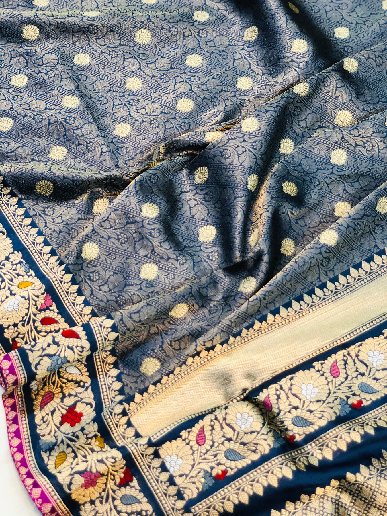 The charming Steel Grey Katan silk Handwoven saree with allover jamawar jaal highlighted with silver jari motifs. Border is kadwa or kadhua mina weave one of the finest of the Banaras collection and even the selvage has been woven. Takes a master artisian around 25 days to weave this rich piece of history.