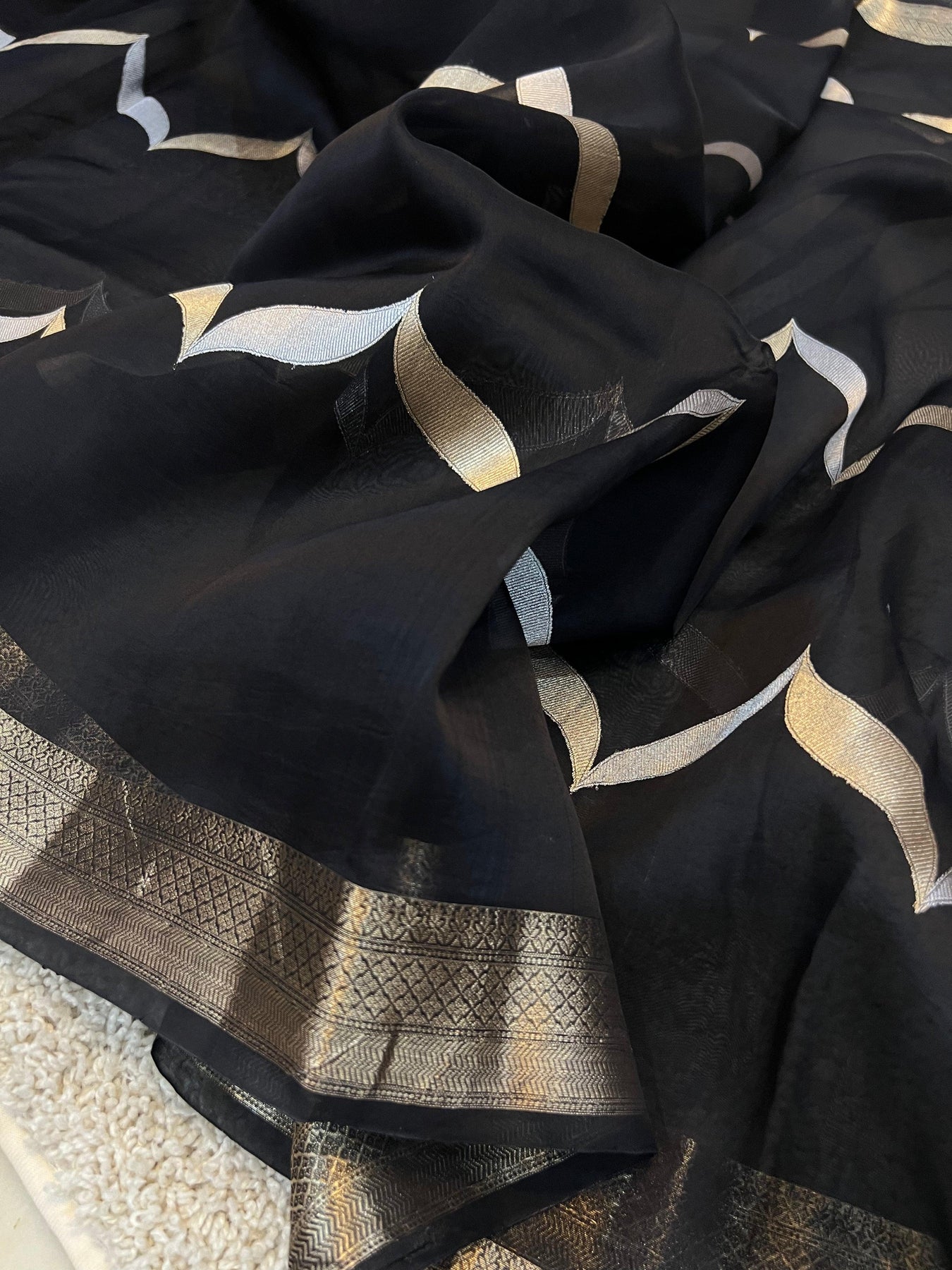 Black Banarasi Handloom Kora Silk Saree - Aura Benaras