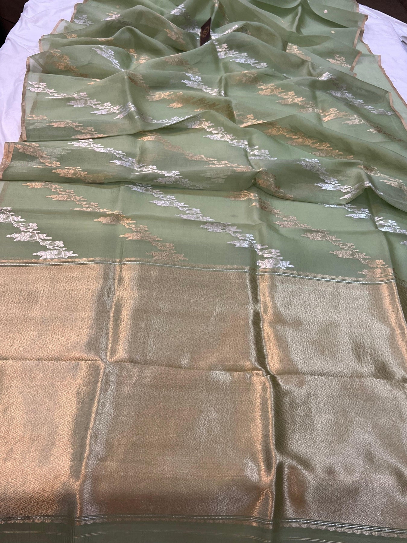 Pastel Olive Green Pure Banarasi Handloom Kora Silk Saree