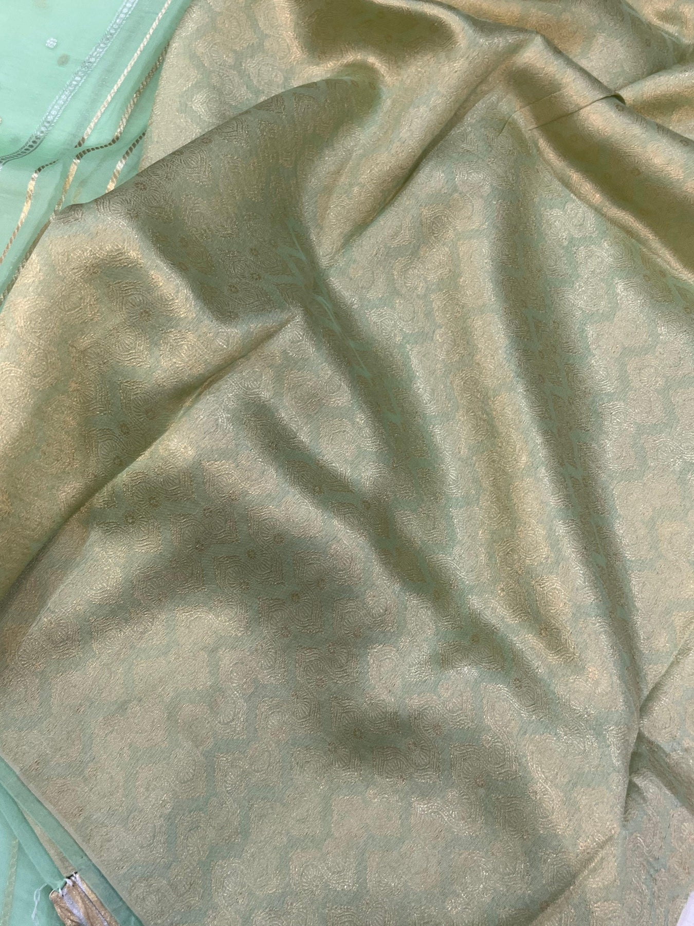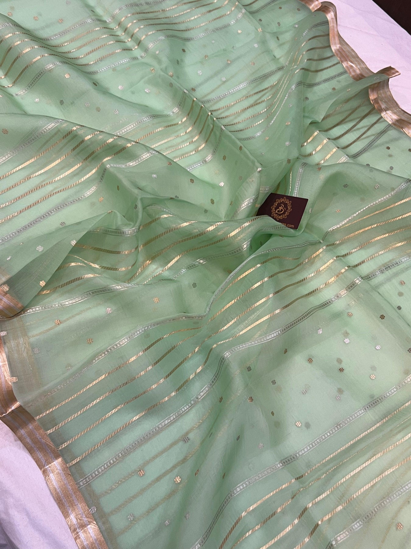 Pista Green Banarasi Handloom Kora Silk Saree - Aura Benaras