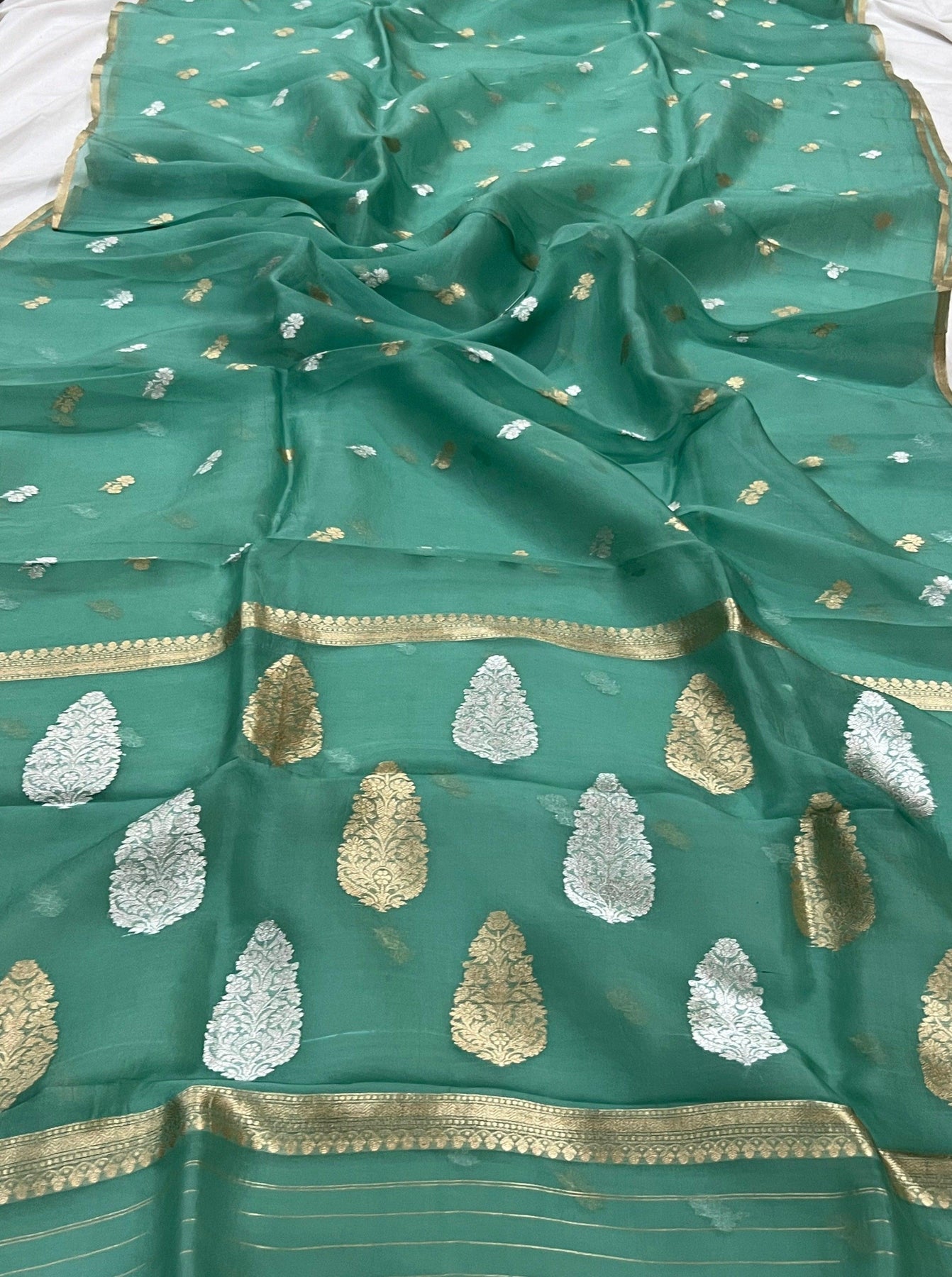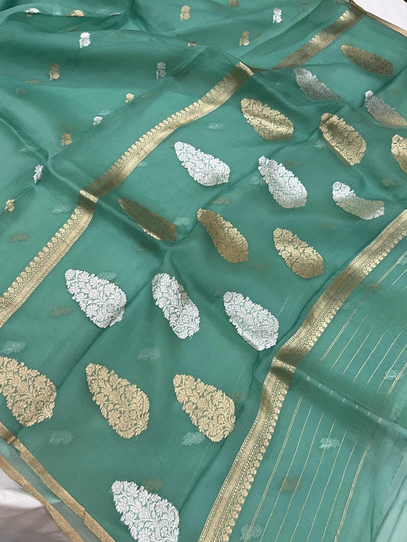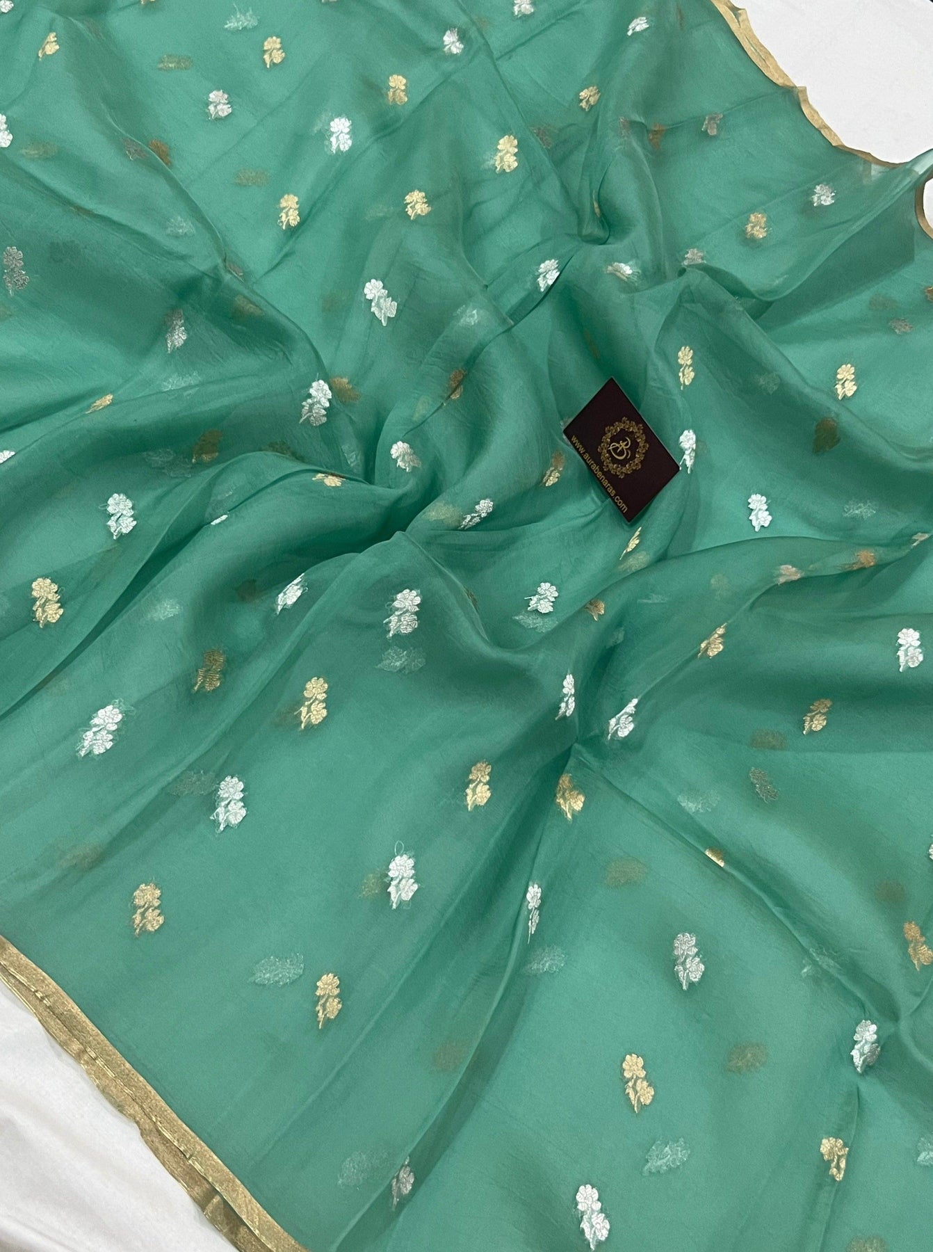 An amazing Handwoven Kora Silk in a Sea Green color to take your breath away. This vintage piece has a allover Kadwa(Kadhua) motifs in golden and silver zari. This handmade treasure exemplifies the Craftsmanship of our Weavers, who have kept the art alive by passing the knowledge from generation to generation. It takes around 15-20 days for artisans to weave one.