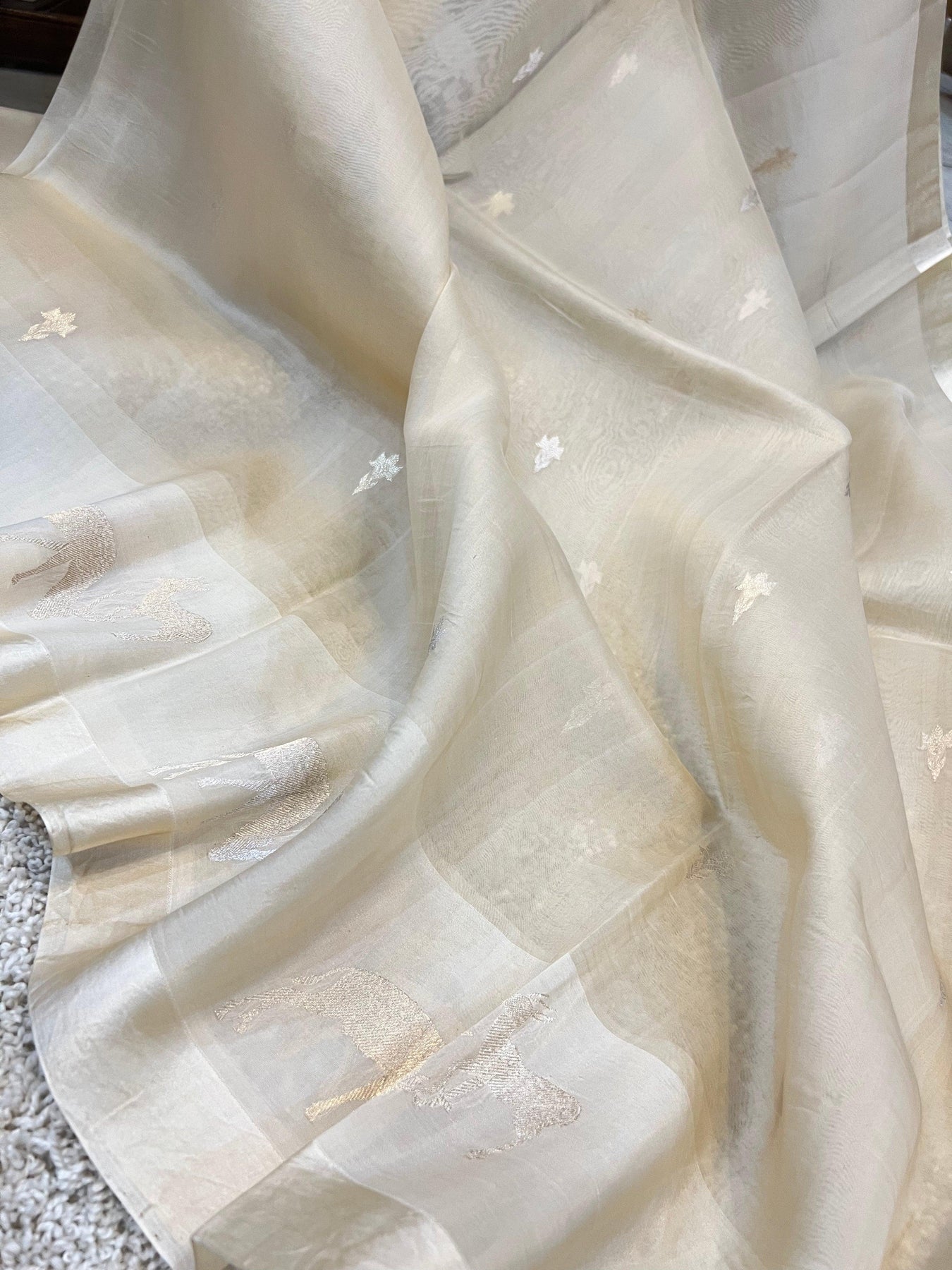 An amazing Handwoven Kora Silk in a Cream color to take your breath away. This vintage piece has allover Kadwa(Kadhua) floral motifs in golden and silver zari with a satin silk border with deer motifs. This handmade treasure exemplifies the Craftsmanship of our Weavers, who have kept the art alive by passing the knowledge from generation to generation. It takes around 15-20 days for artisans to weave one.