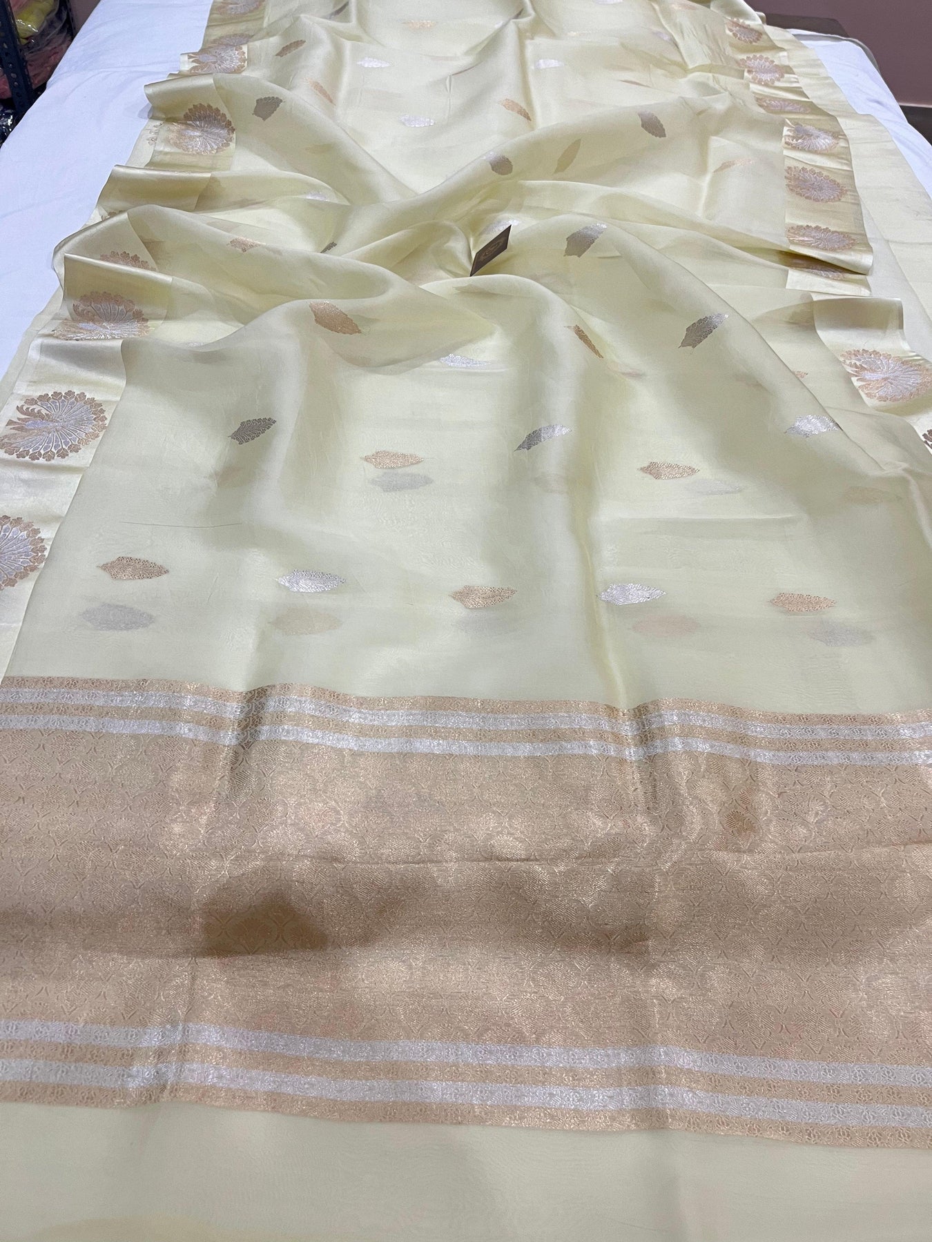 Cream Pure Banarasi Handloom Kora Silk Saree