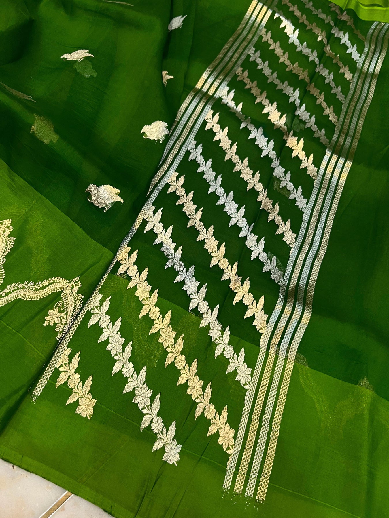 Mehendi Green Banarasi Handloom Kora Silk Saree