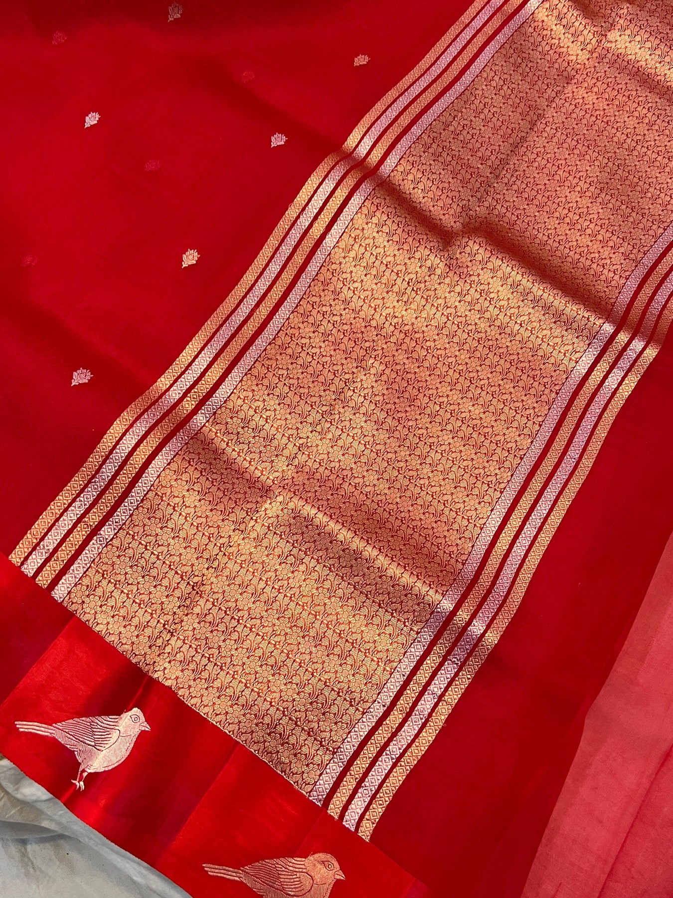 Experience timeless elegance with our Pure Banarasi Handloom Kora Silk Saree, adorned with exquisite Kadhwa Butis. The saree features a stunning Mashru Silk Border, beautifully woven with Kadhwa Bird Motifs, adding a touch of heritage charm. Paired with a plain blouse piece with a matching border, this masterpiece is a perfect blend of tradition and sophistication.