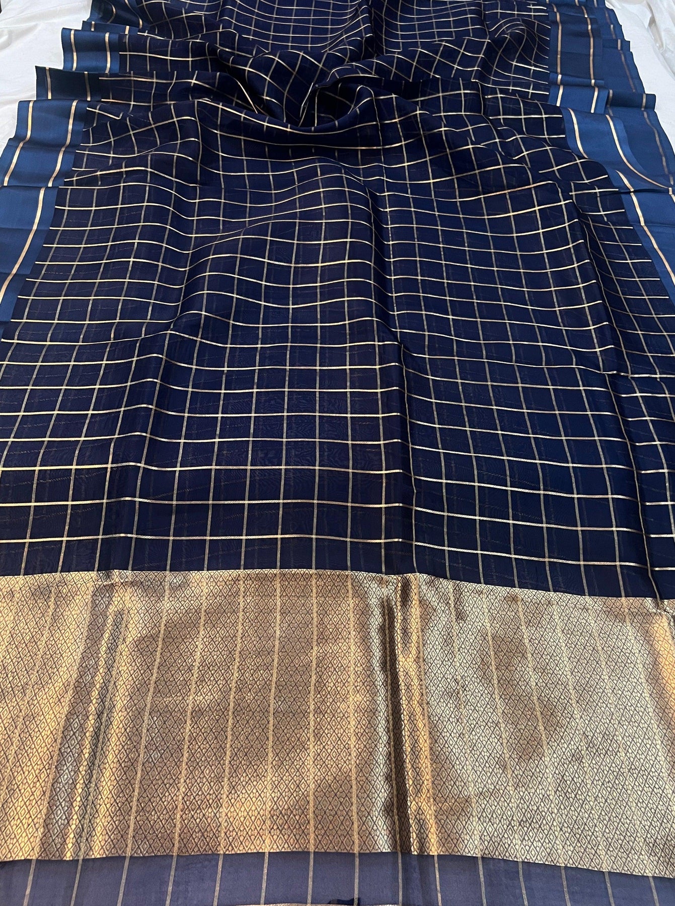 An amazing Handwoven Pure Kora Silk in a Teal color to take your breath away. This vintage piece has an allover cheks in golden zari. The border is beautifully woven in satin silk with golden zari lines running parallel till the end. It comes with a plain blouse piece.