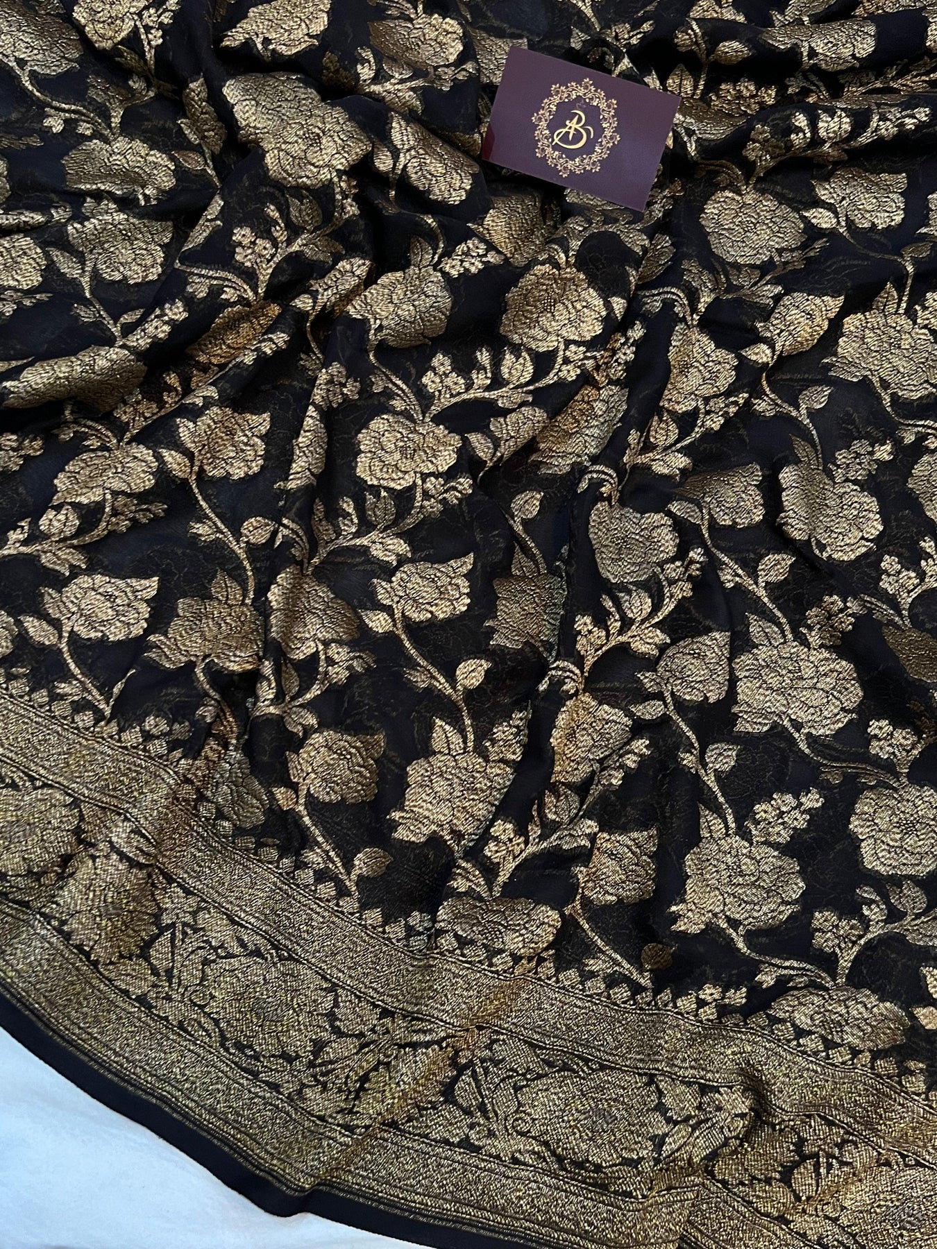 Indulge yourself with the elegance of Banaras with this Black saree. The minute, antique zari floral jaal design over the Black color and edges, gives the royal look to you & make you shine with richness and love at every occasion.