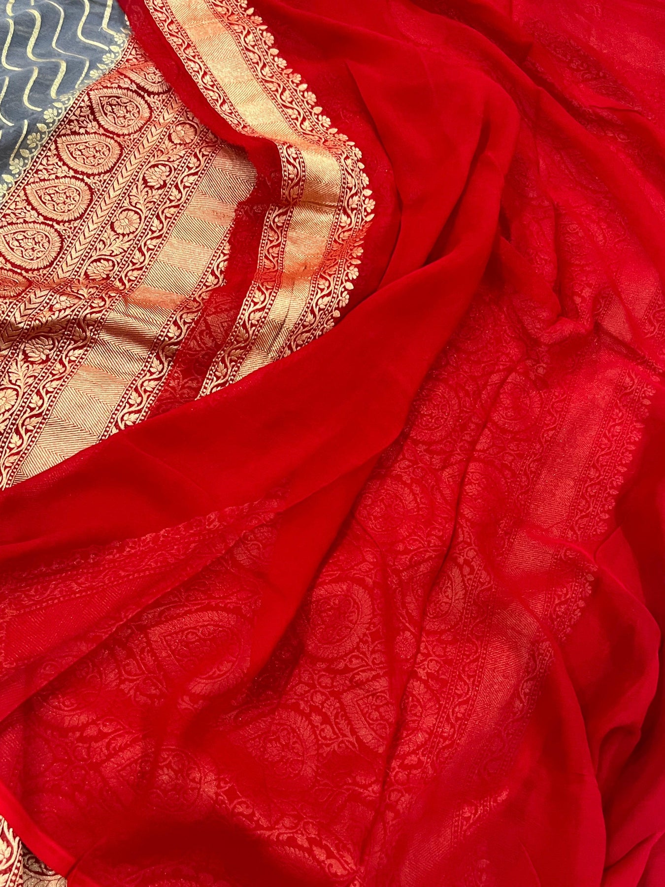 A stunning Grey Banarasi handloom classic. The authentic aada work in golden zari handwoven in the finest chiffon georgettes, comes with a plain blouse. It takes around 10 days to weave this rich and luxurious piece of our tradition.