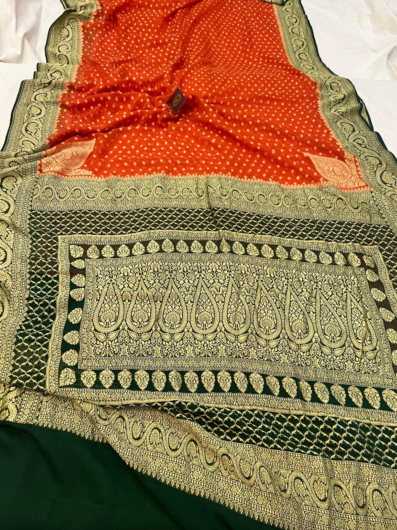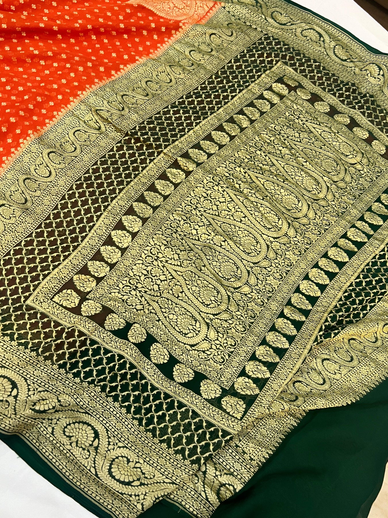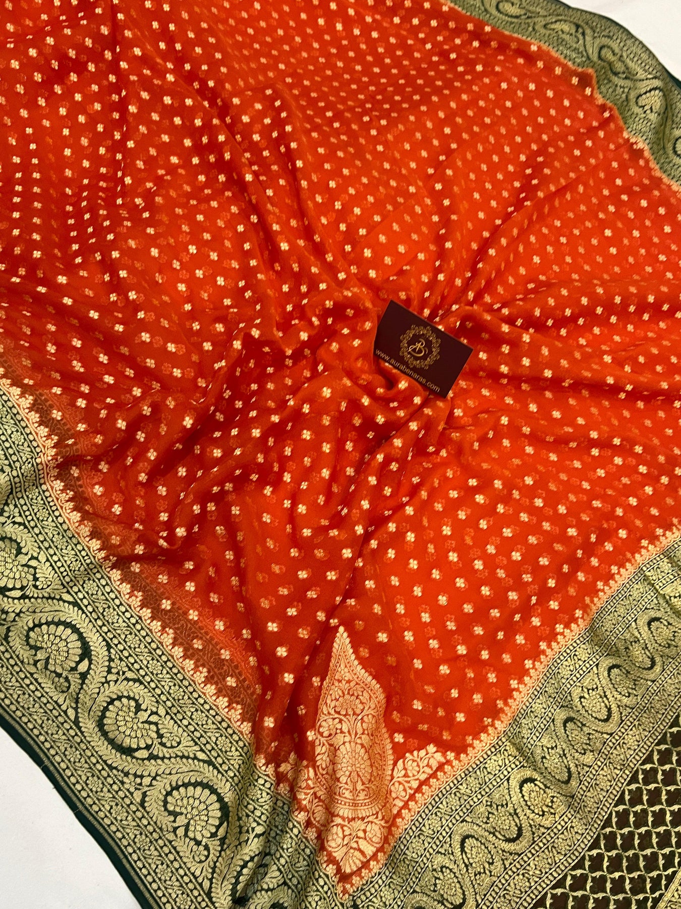 A stunning Orange Banarasi handloom classic. The authentic buti work in golden zari handwoven in the finest chiffon georgettes, comes with a plain blouse. It takes around 10 days to weave this rich and luxurious piece of our tradition.