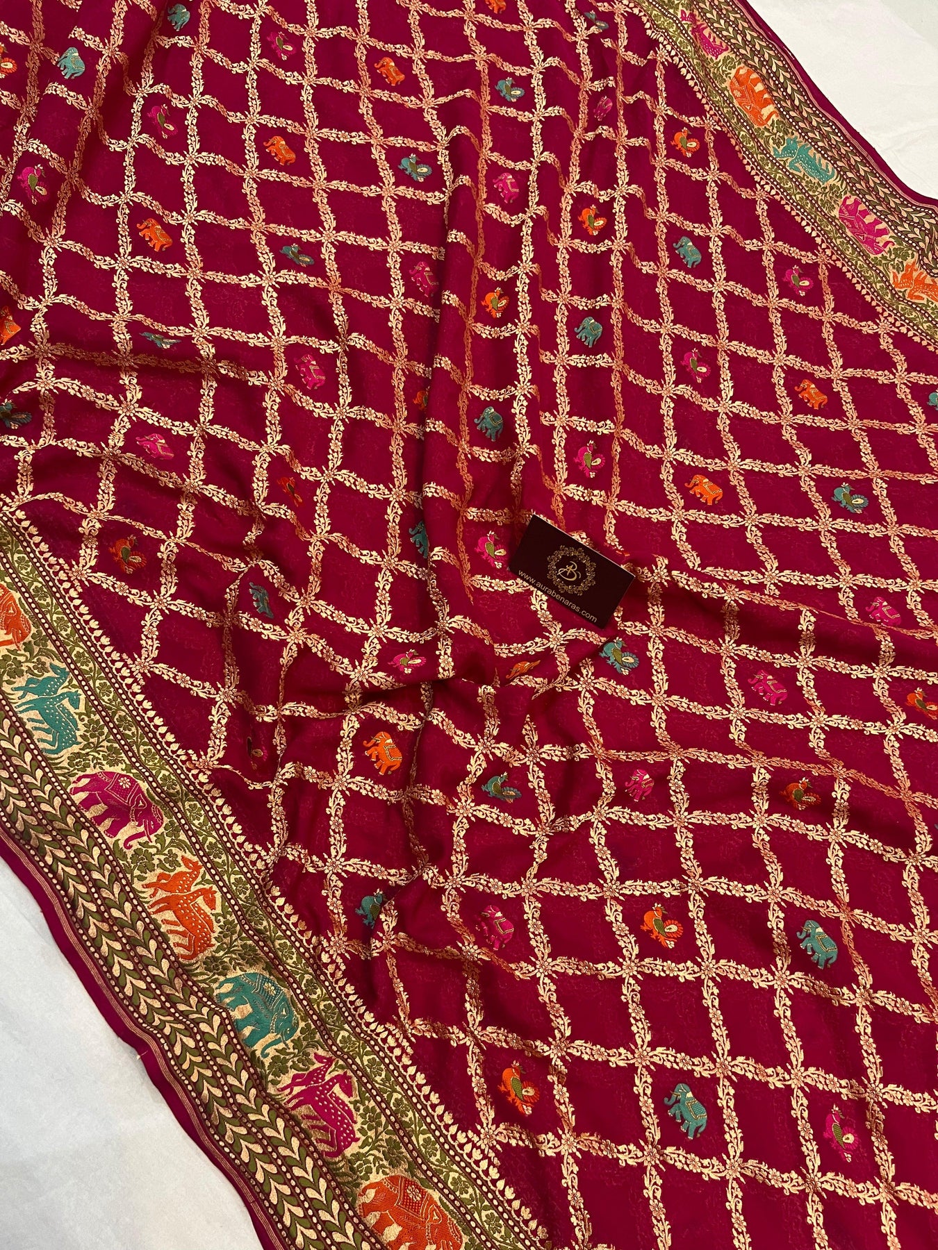A stunning Rani Pink Banarasi handloom classic.The authentic tilfi patola jaal work with golden zari handwoven in the finest chiffon georgettes,with minakari work comes with a plain blouse.It takes around 10 days to weave this rich and luxurious piece of our tradition.