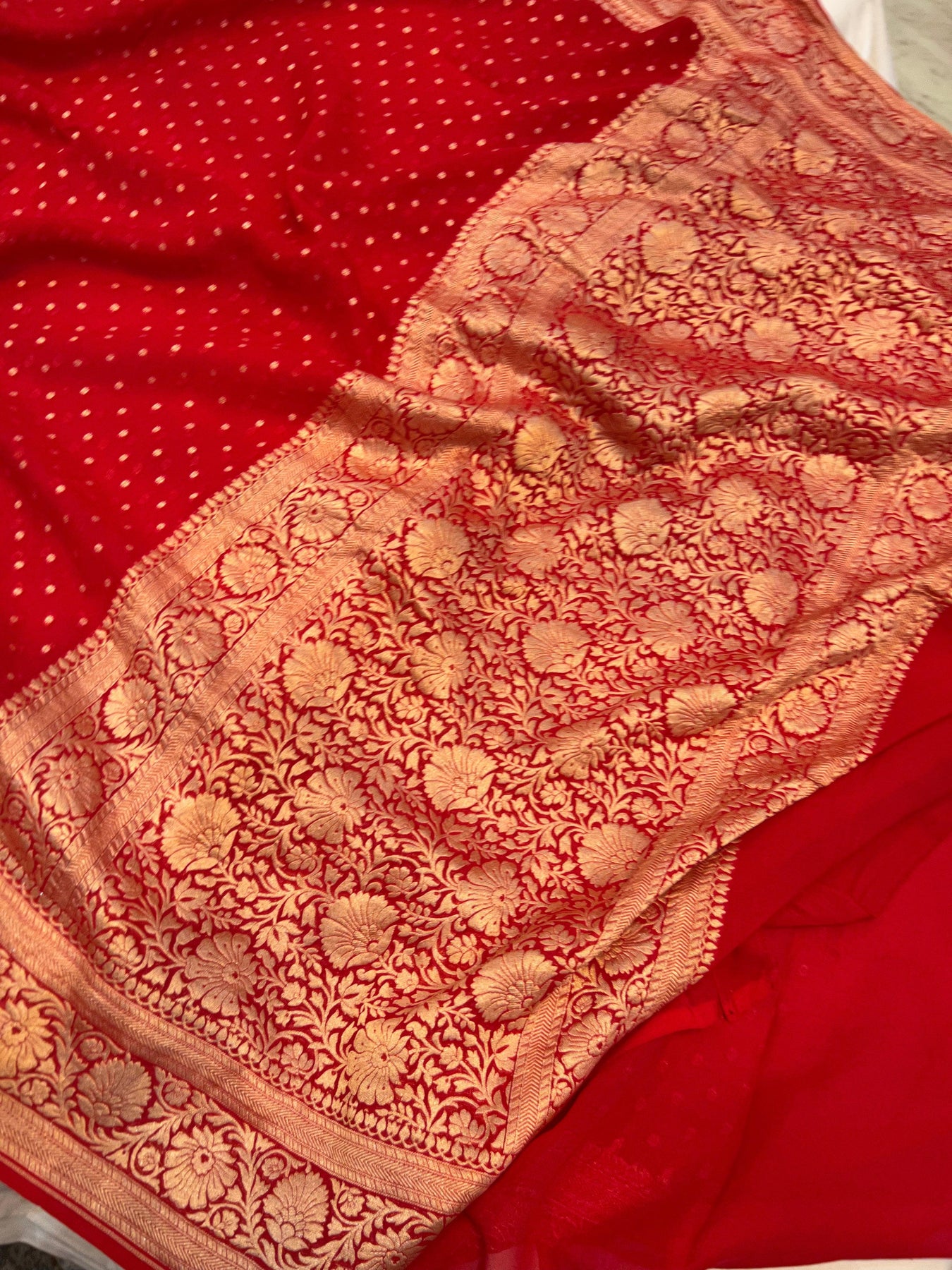 A stunning Red Banarasi handloom classic. The authentic buti work in golden zari handwoven in the finest chiffon georgettes, comes with a contrast plain blouse. It takes around 10 days to weave this rich and luxurious piece of our tradition.