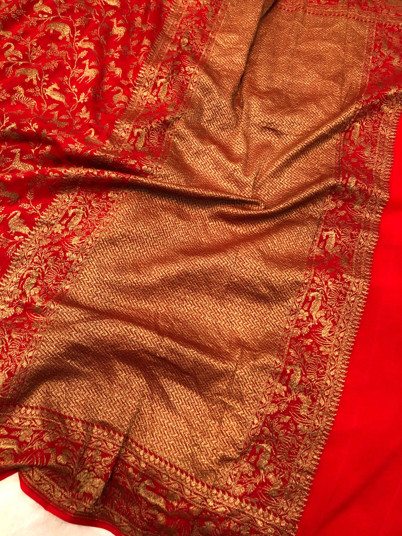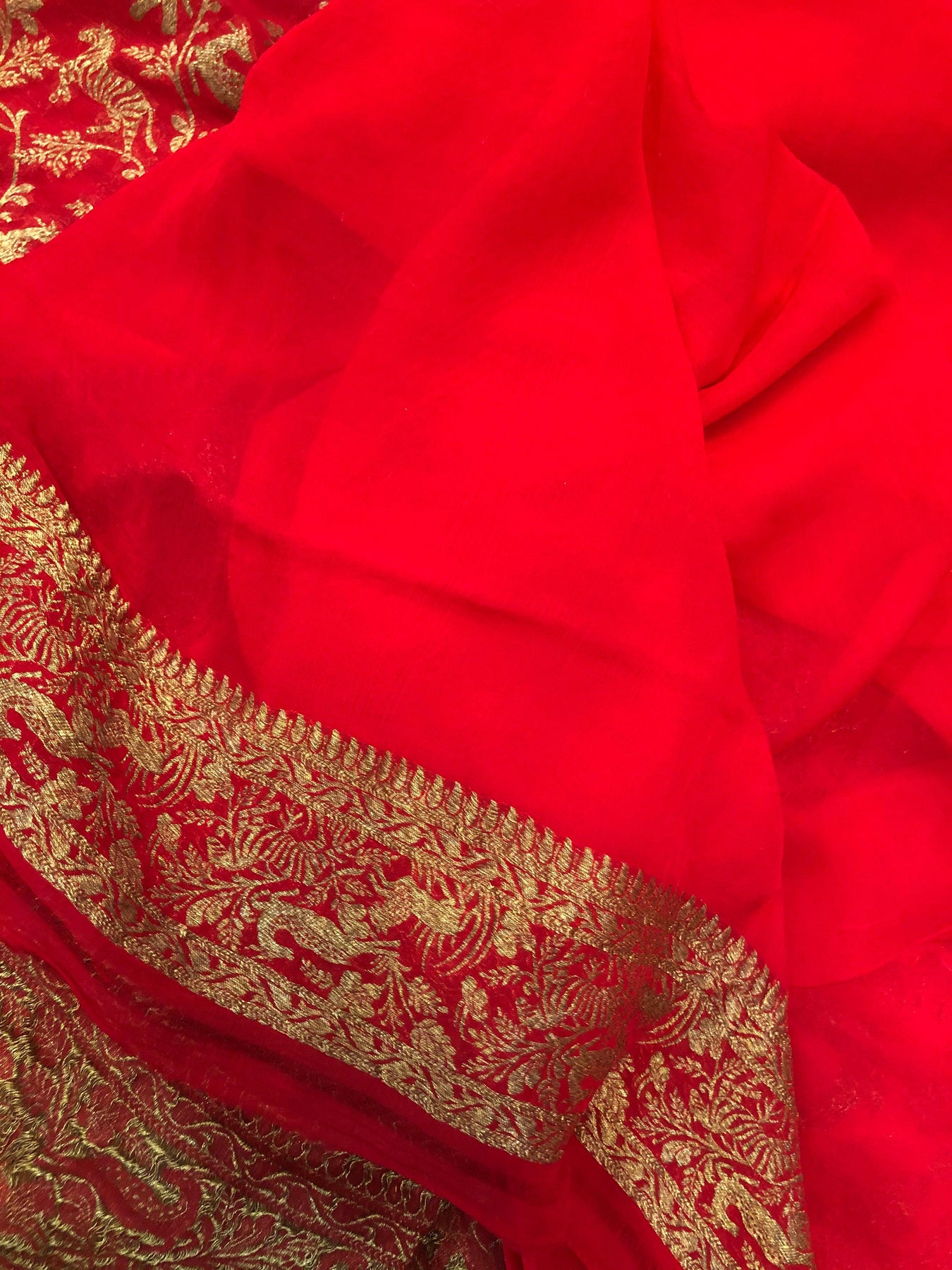 A stunning red Banarasi handloom classic with broad border.The authentic shikargaah work with antique zari handwoven in the finest chiffon georgettes,comes with a plain blouse.It takes around 10 days to weave this rich and luxurious piece of our tradition.