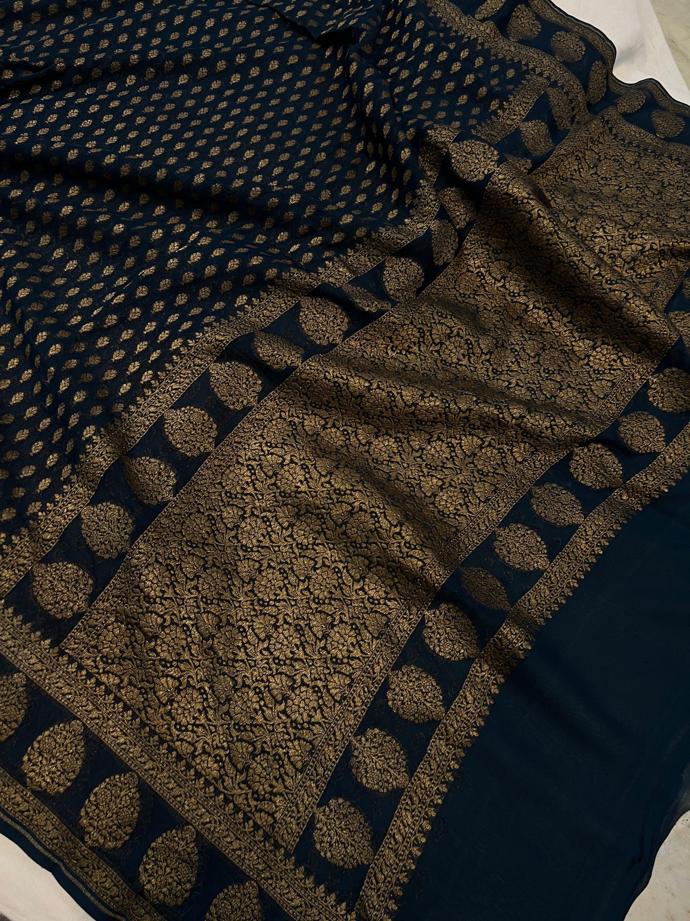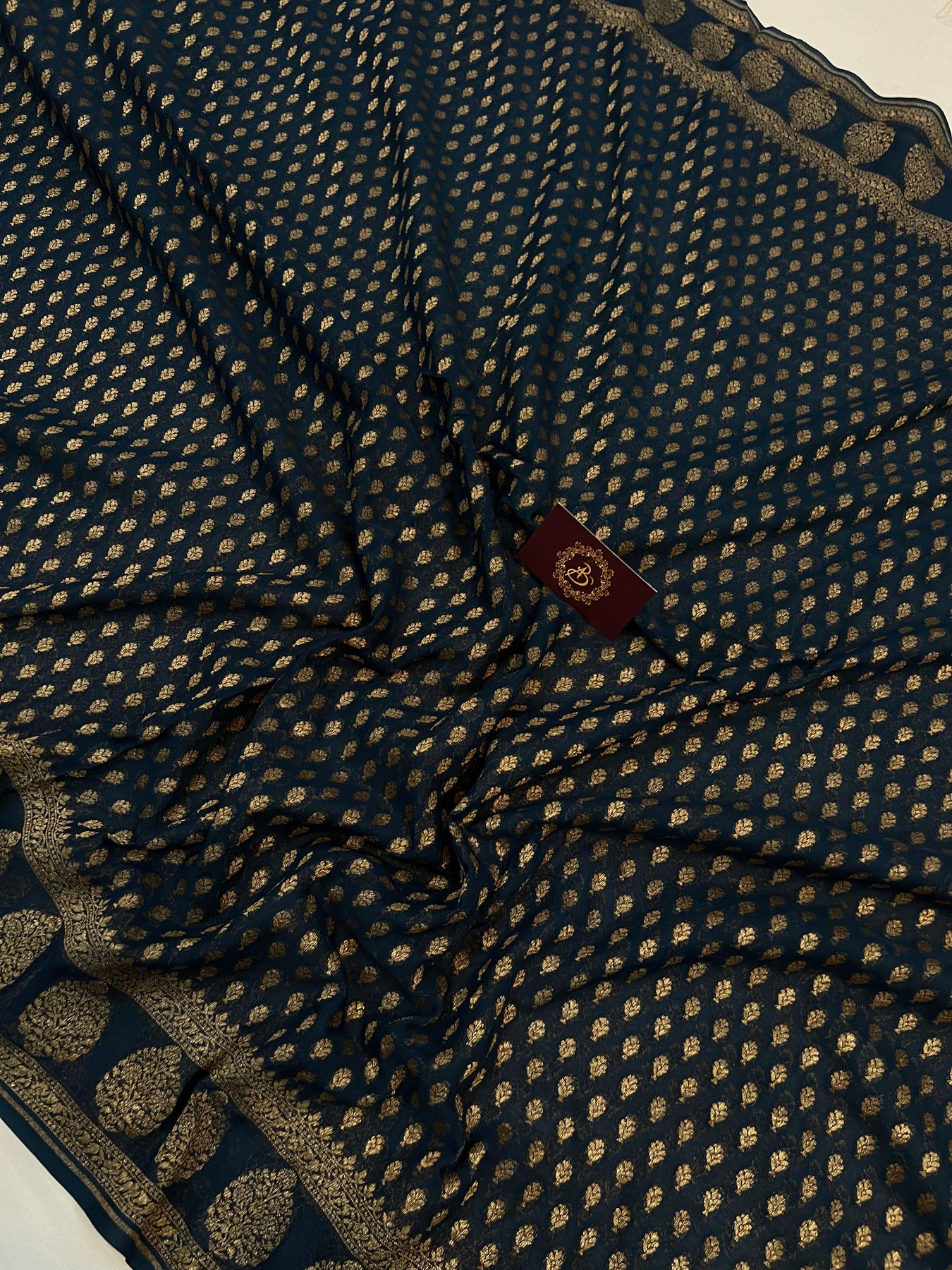 Teal Blue Banarasi Handloom Pure Khaddi Georgette Saree