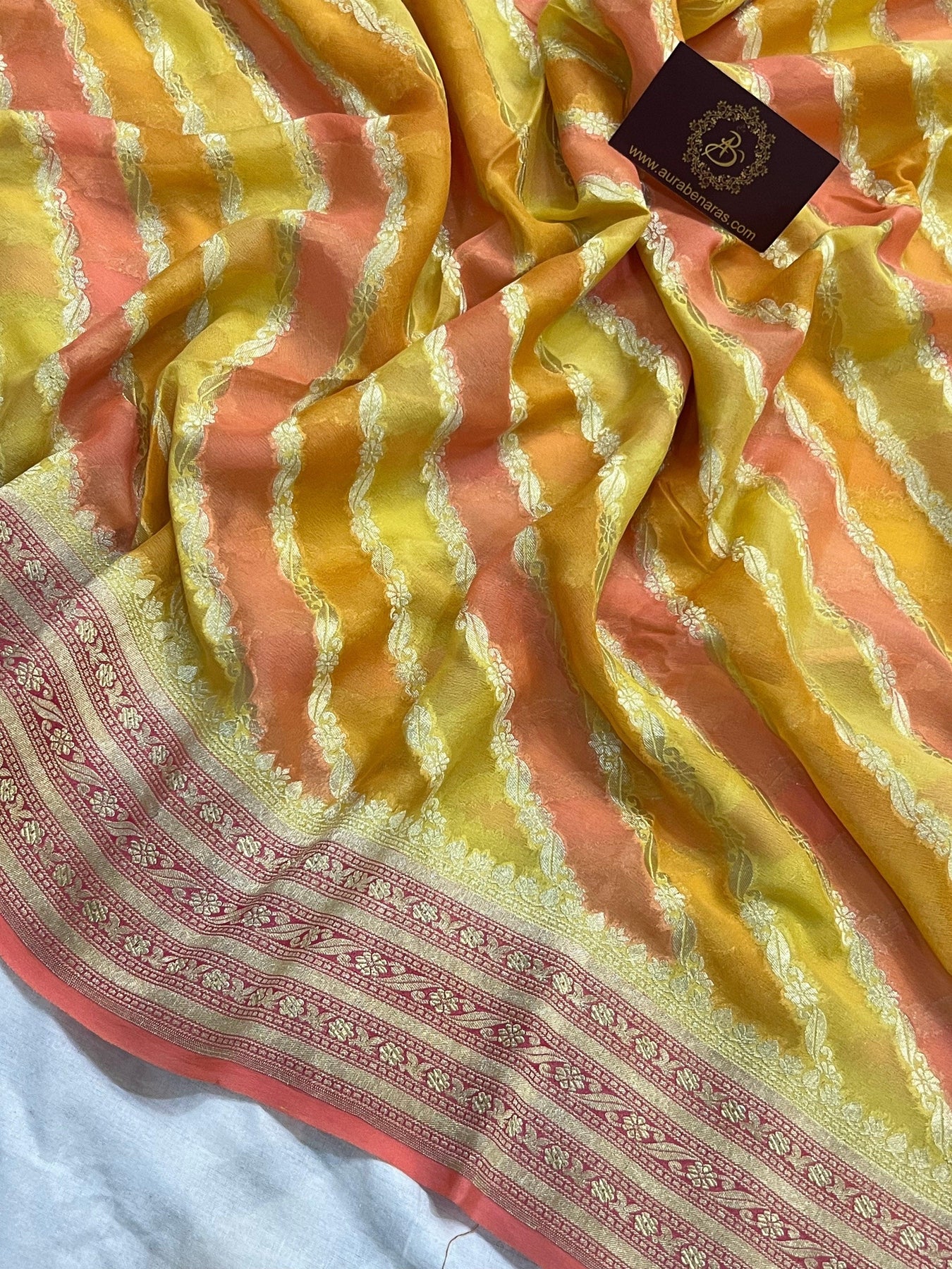 A stunning Yellow rangkaat Banarasi handloom classic. The authentic aara design woven in light golden zari handwoven in the finest chiffon georgettes, comes with a plain blouse.It takes around 10 days to weave this rich and luxurious piece of our tradition.