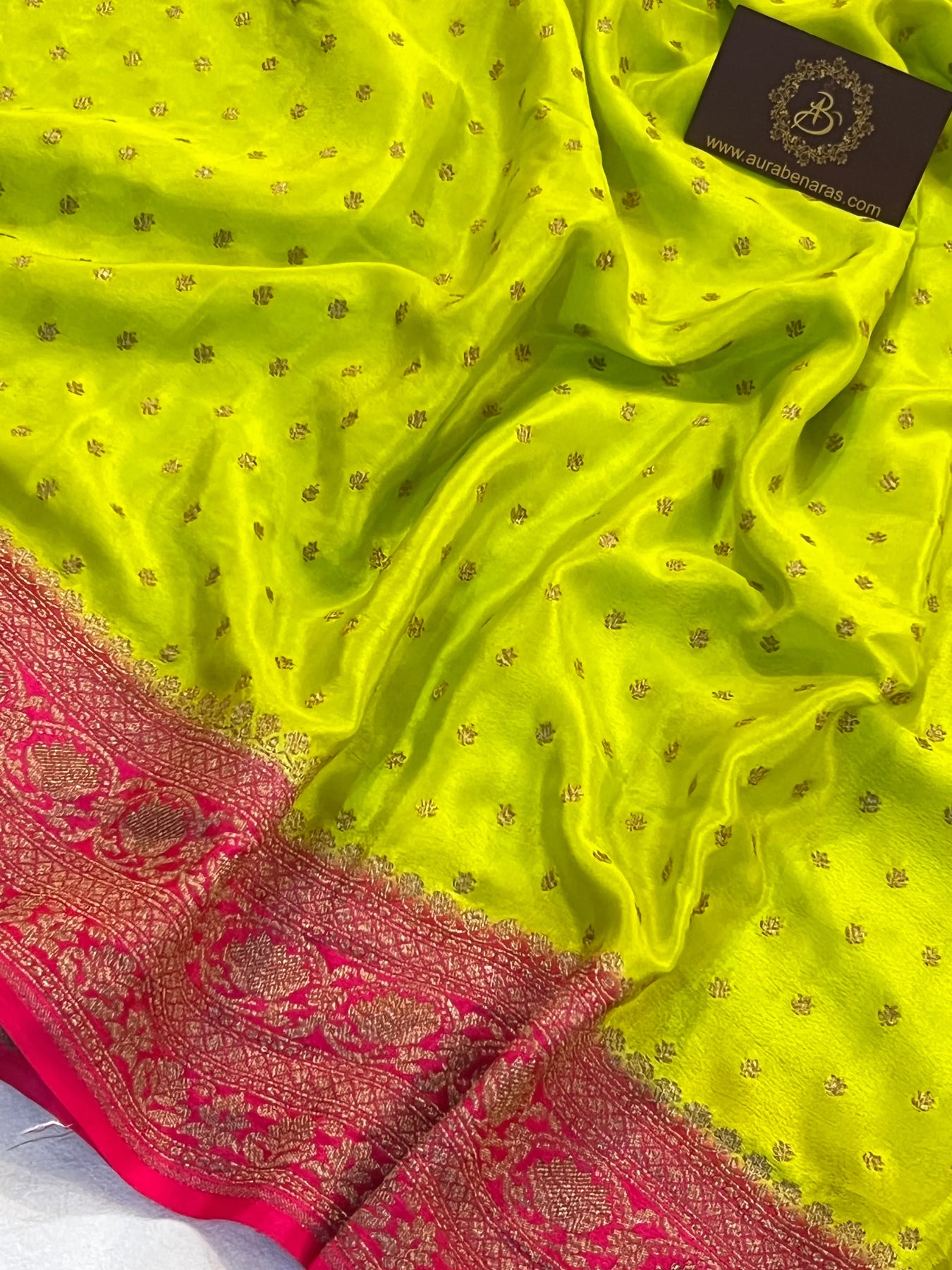 Neon Green Pure Crepe Silk Handloom Banarasi Saree