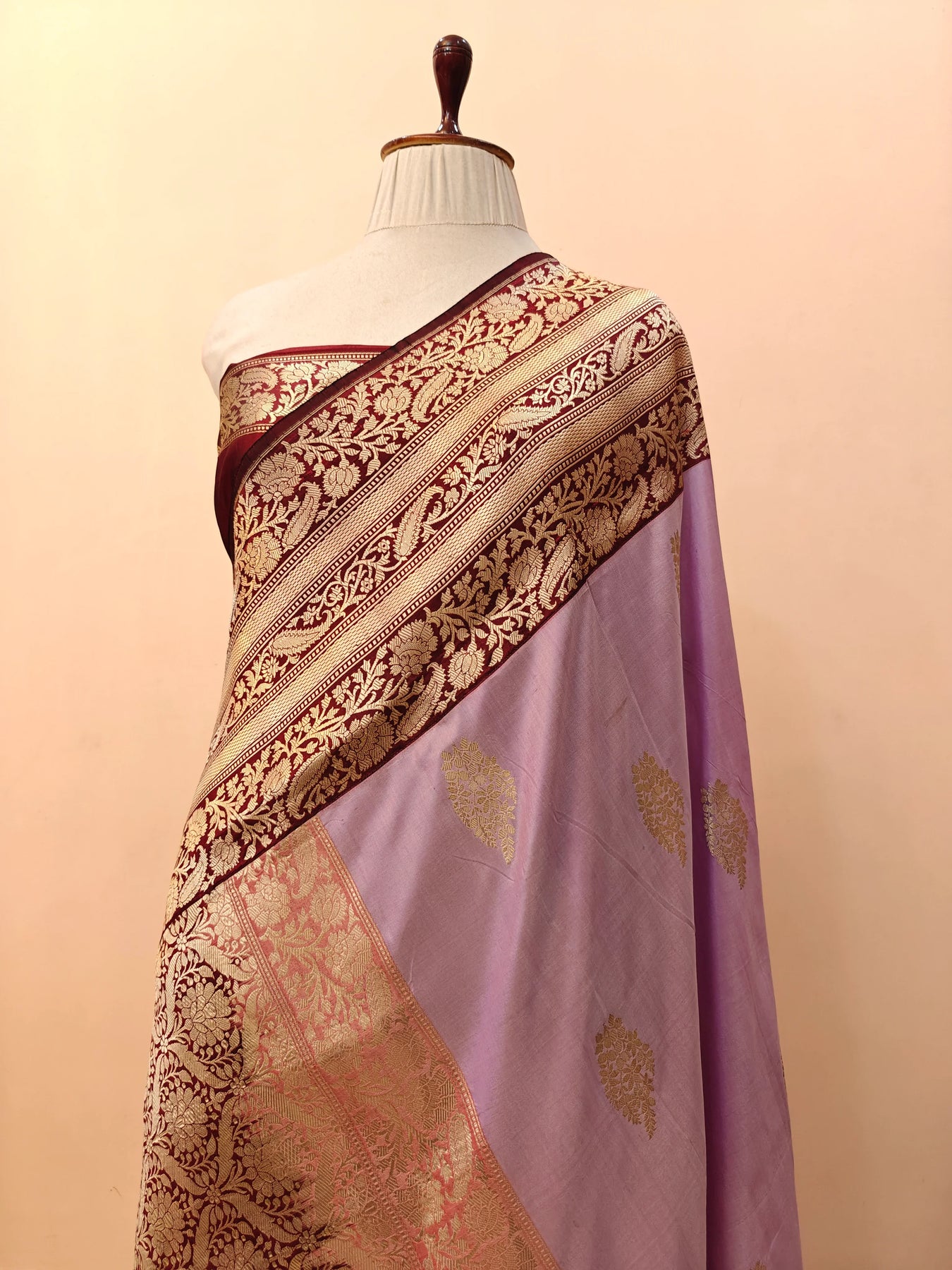 - Color - Lilac Banarasi saree with Brown contrast border.