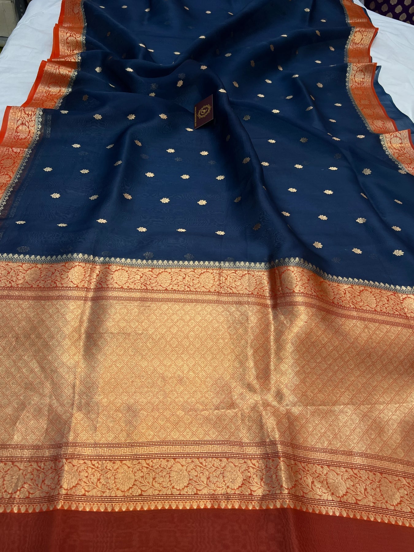 - Color - Navy blue Banarasi saree with Orange contrast border.