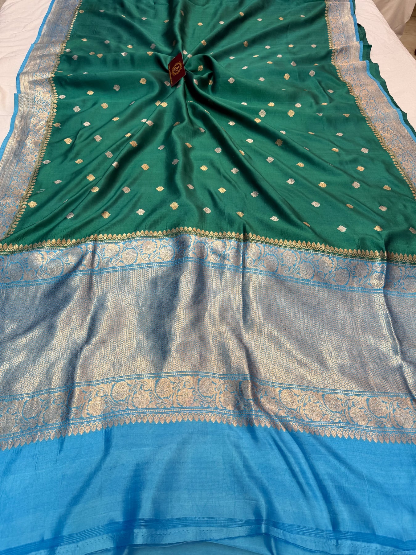 - Color - Green Banarasi saree with Sky Blue contrast.