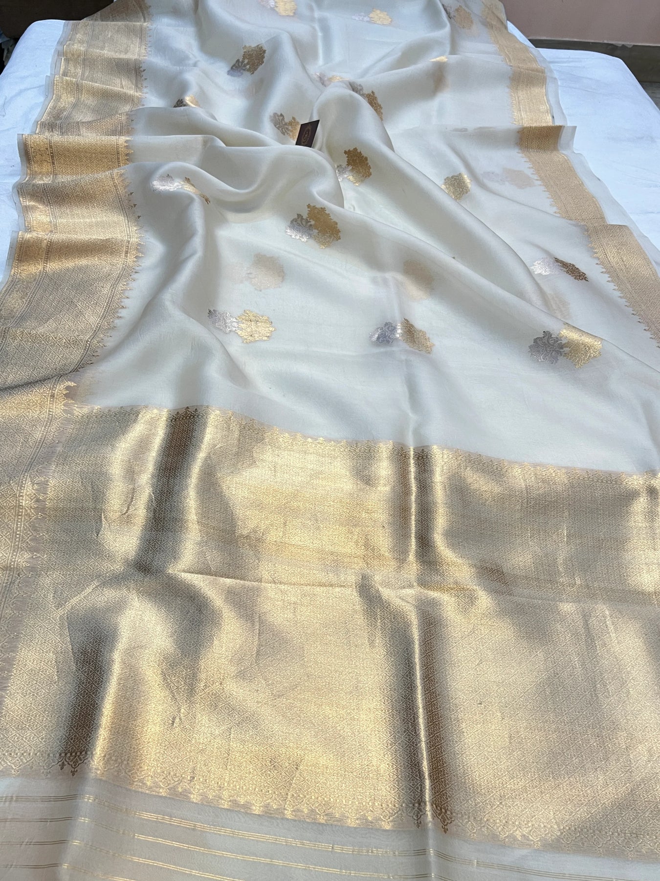 Off White Pure Kora Silk Handloom Banarasi Saree