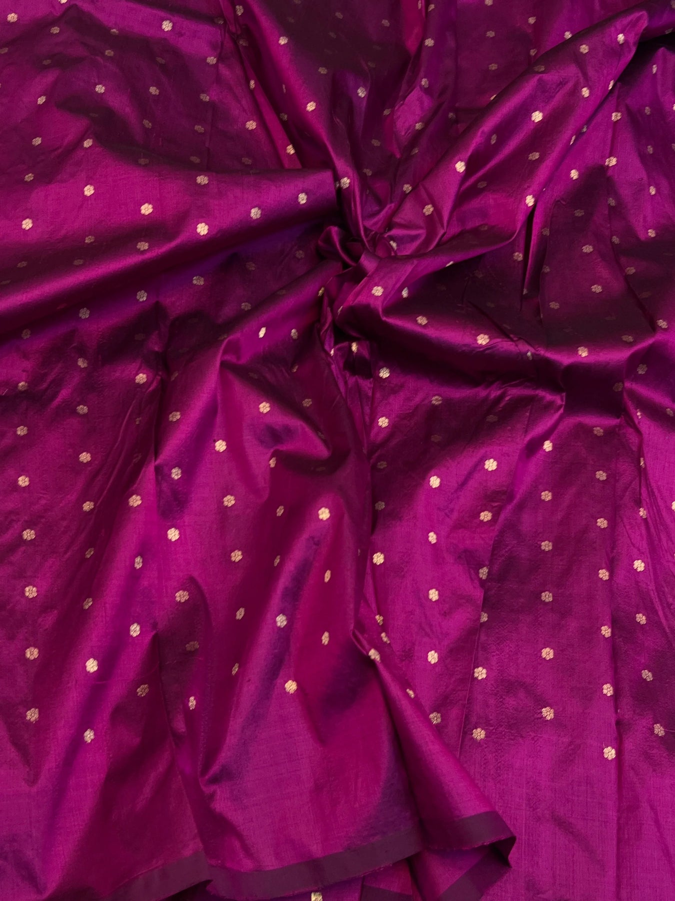 Immerse yourself in the timeless charm of this Purple Pure Katan Silk Handloom Banarasi Saree, gracefully woven with delicate fekhwa floral motifs that celebrate heritage artistry. The rich kadhwa Banarasi border in golden zari adds a regal touch, enhancing the elegance of the lustrous silk drape. Perfect for weddings, festivities, or cultural celebrations, this masterpiece is paired with a matching blouse featuring small butis and a complementing border. A true testament to Banaras' enduring craftsmanship.