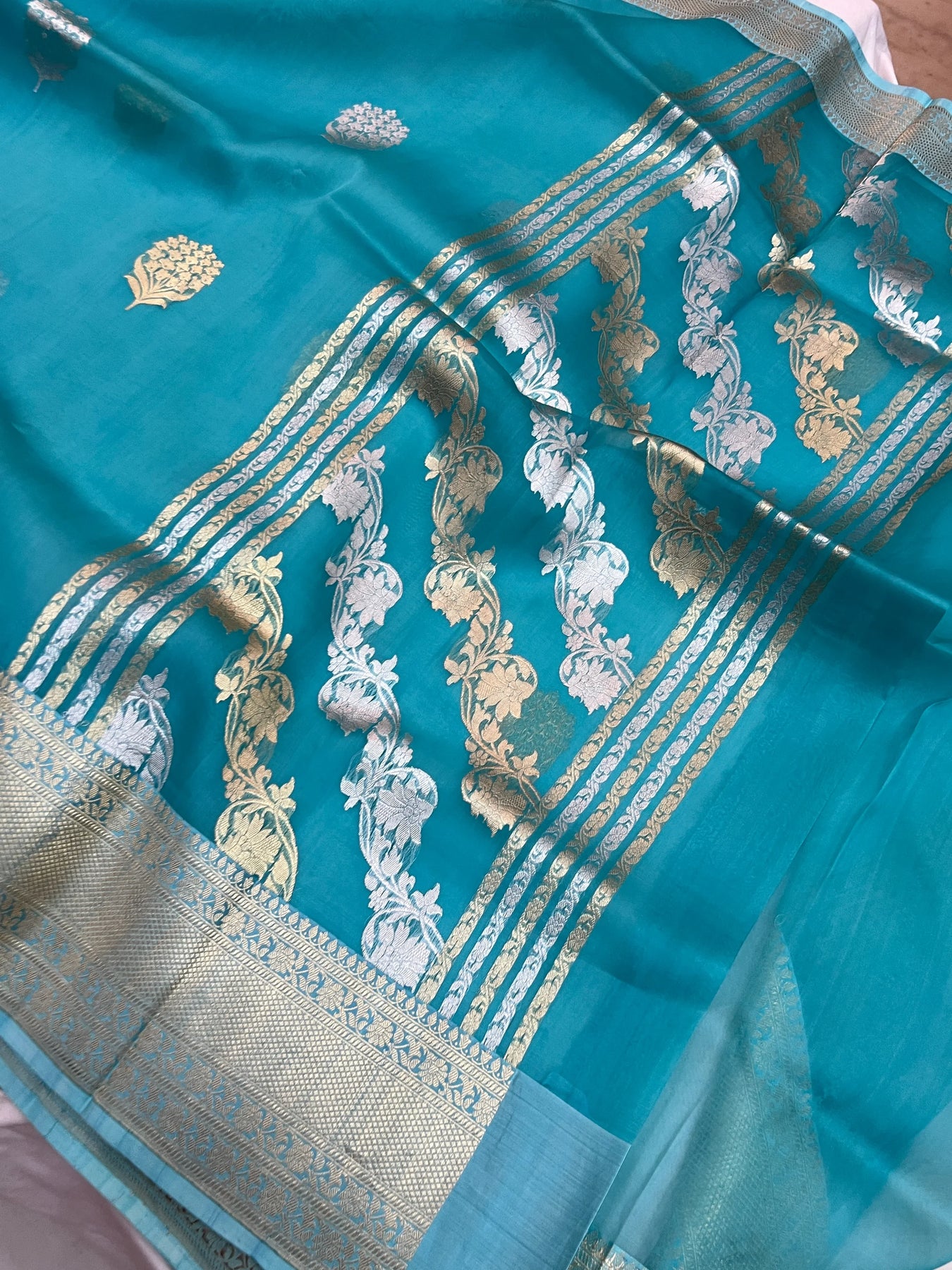 Rama Blue Pure Kora Silk Handloom Banarasi Saree