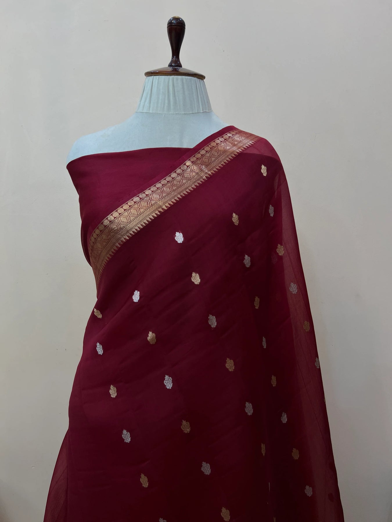 • Color - Maroon Banarasi saree.