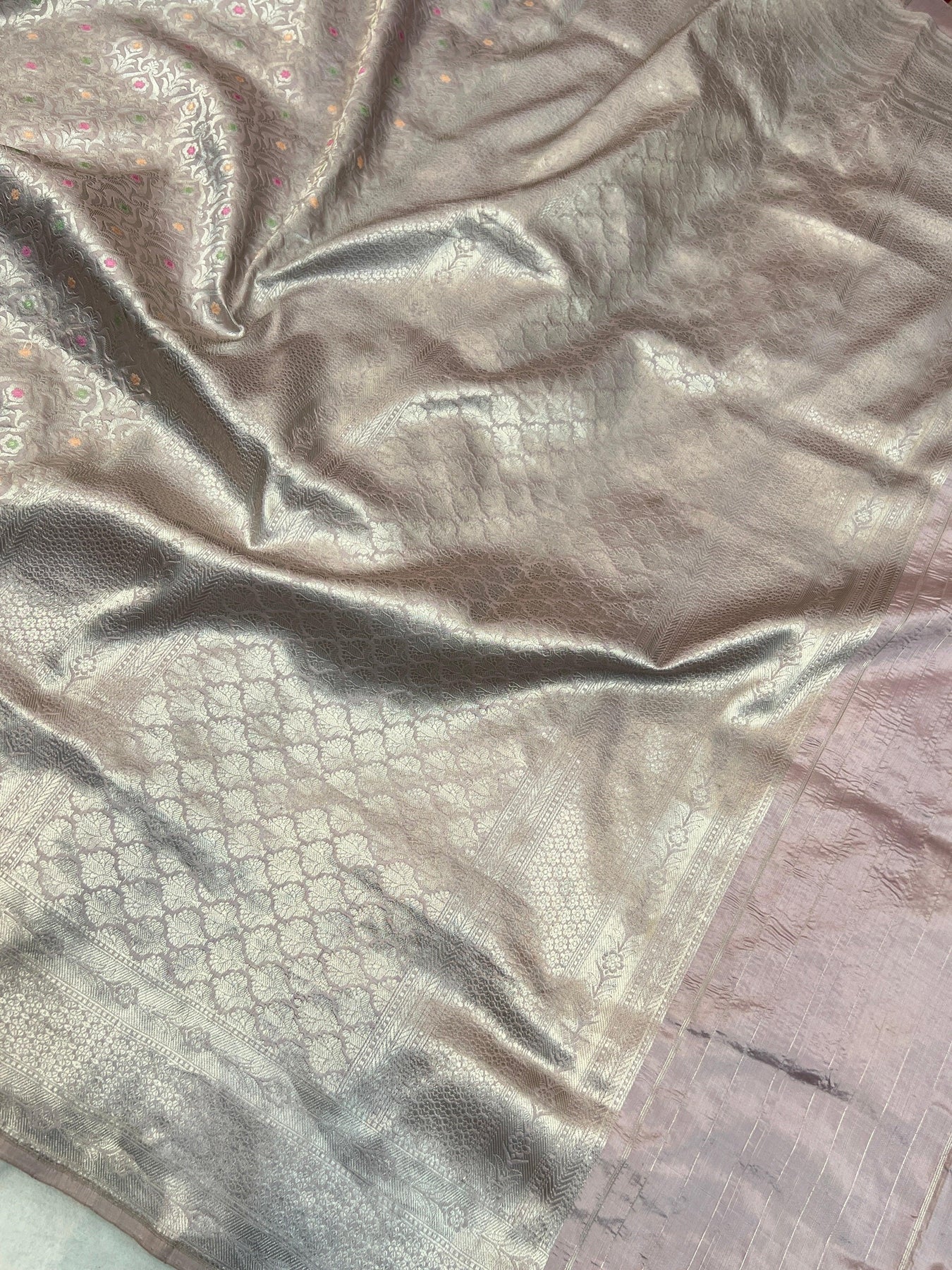 Immerse yourself in the luxurious elegance of this Silver Thistle Beige pure Katan silk handloom Banarasi saree, exquisitely adorned with allover meenakari brocade work. The intricate floral design features vibrant enamel-inspired meenakari detailing, beautifully woven into the rich silk fabric for a regal and sophisticated look. A traditional Banarasi border and a lavish palla complete the ensemble, adding an extra touch of grandeur and tradition. Ideal for weddings and festive occasions, this masterpiece is paired with a plain blouse piece to allow the intricate meenakari patterns to truly shine. This timeless Banarasi saree perfectly captures the artistry of Varanasi’s weaving heritage.