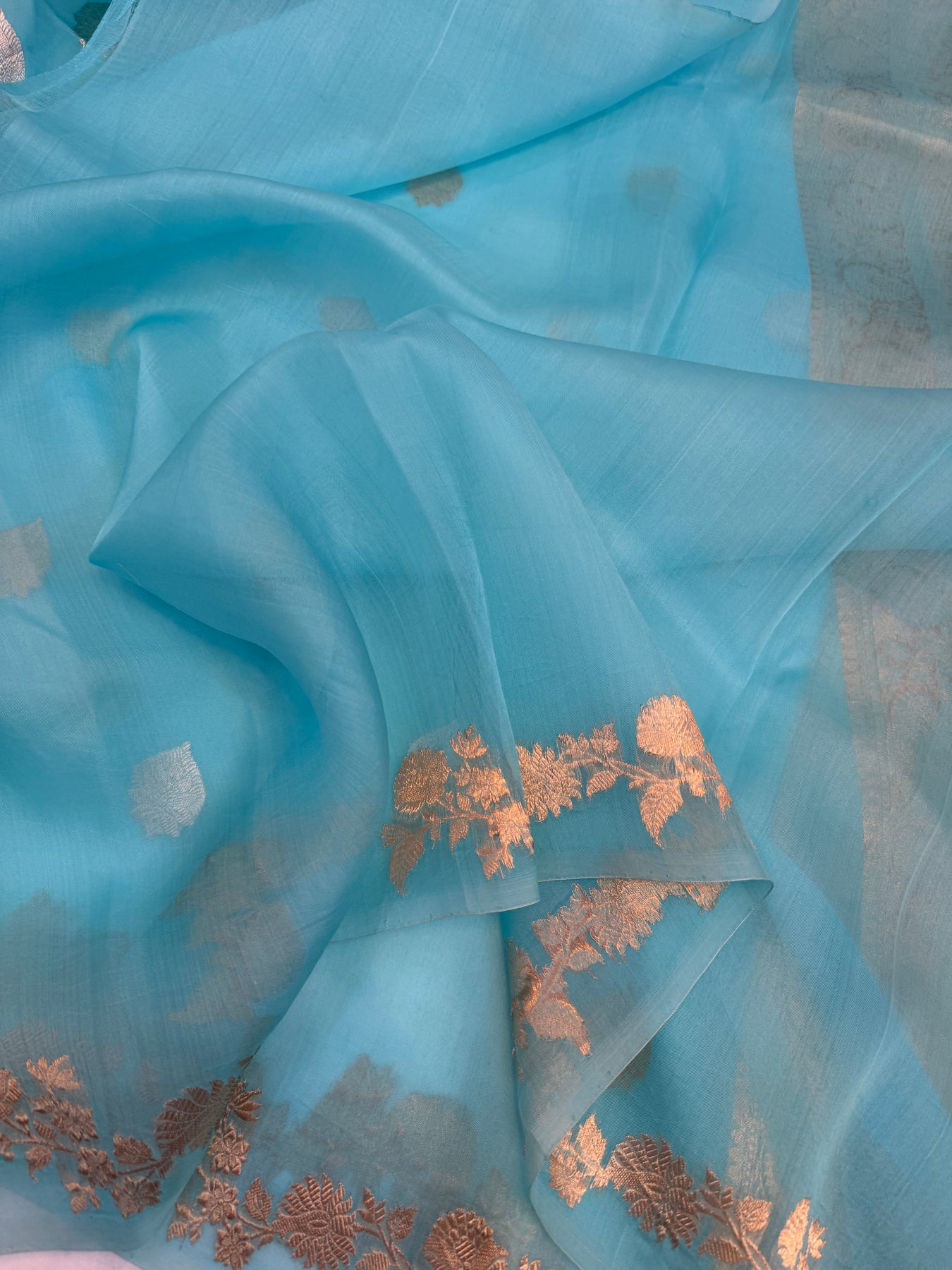 Sky Blue Pure Kora Silk Handloom Banarasi Saree