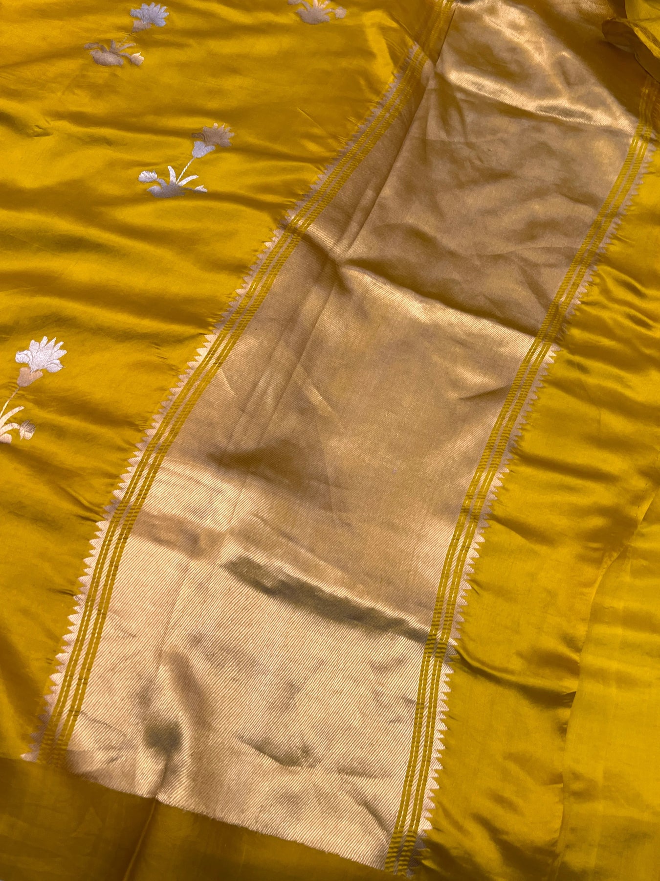 This Yellow pure silk Banarasi saree is a timeless handloom masterpiece. It features intricate Kadhwa floral butas in golden and silver zari. The motifs are handwoven, reflecting traditional Banarasi craftsmanship. A sleek, plain Mashru silk border adds a contemporary designer touch. The contrast between the rich body and minimal border creates visual elegance. The royal blue shade exudes depth, grace, and sophistication. This saree is ideal for weddings, festive occasions, and formal gatherings. It drapes beautifully with a luxurious, soft finish. The saree comes with a plain blouse piece that includes a matching border. A perfect blend of tradition, luxury, and modern minimalism.
